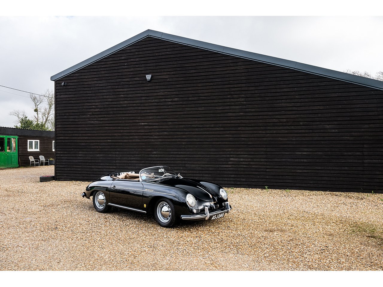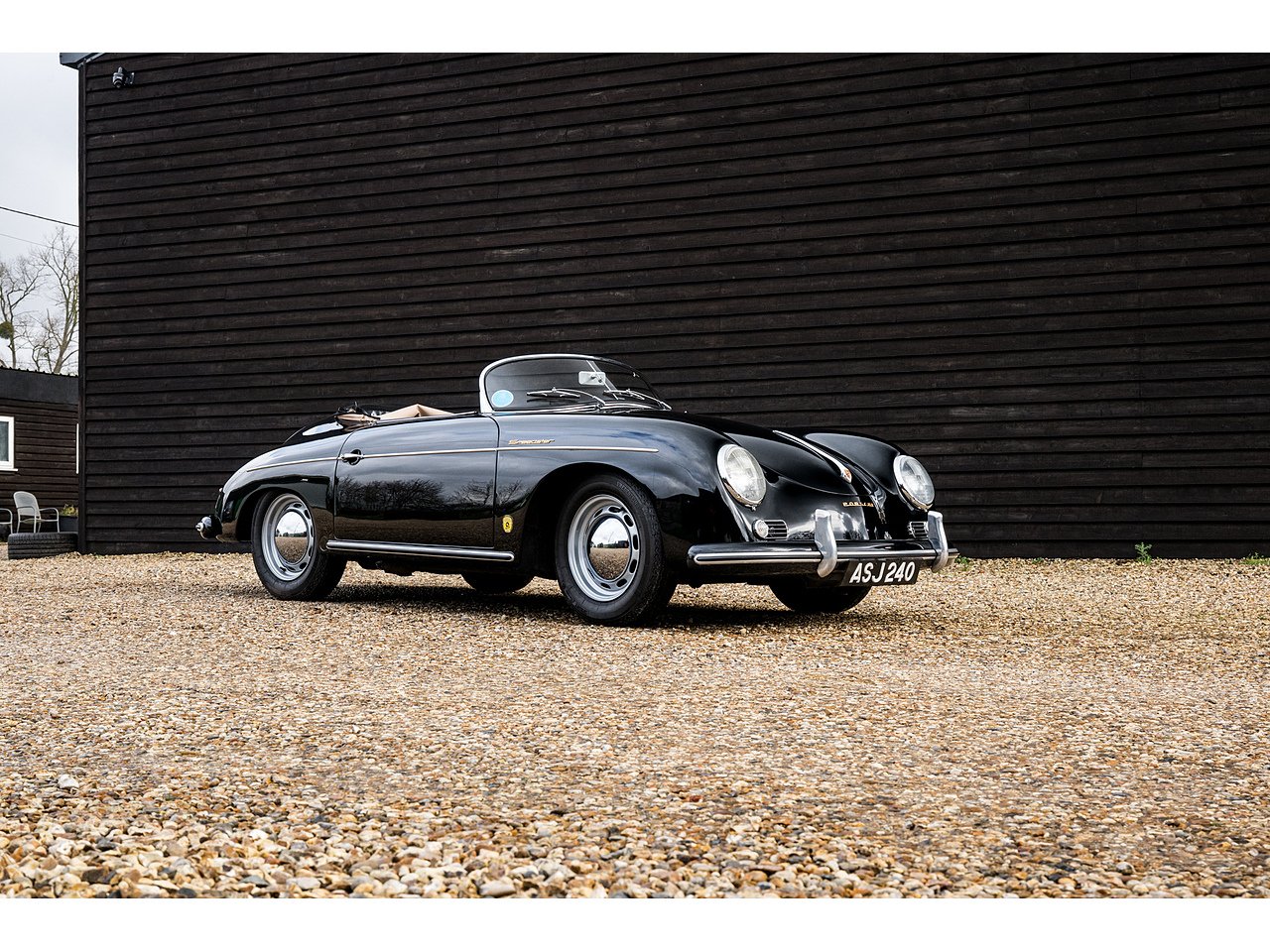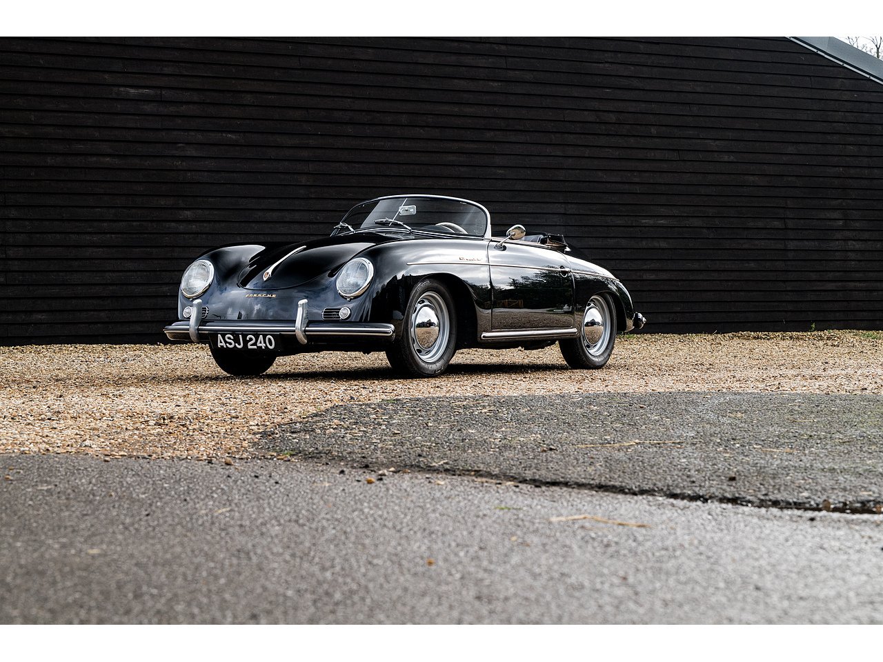 This is a restored Porsche 356A Speedster in black with a black interior, accompanied by a Porsche Certificate of Authenticity and a comprehensive restoration file. It has a removable roof, service history, and is described as a handsome example, making it suitable for collectors and enthusiasts.