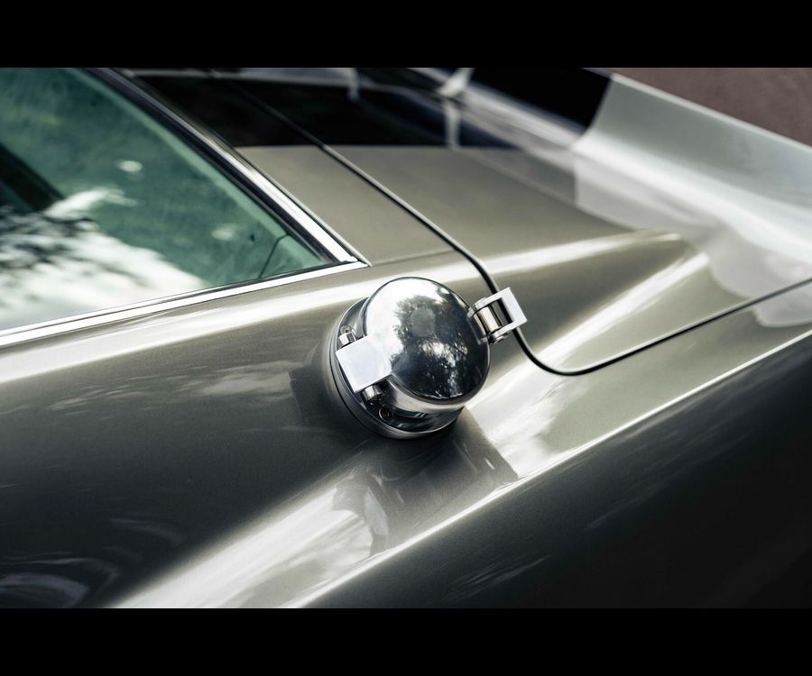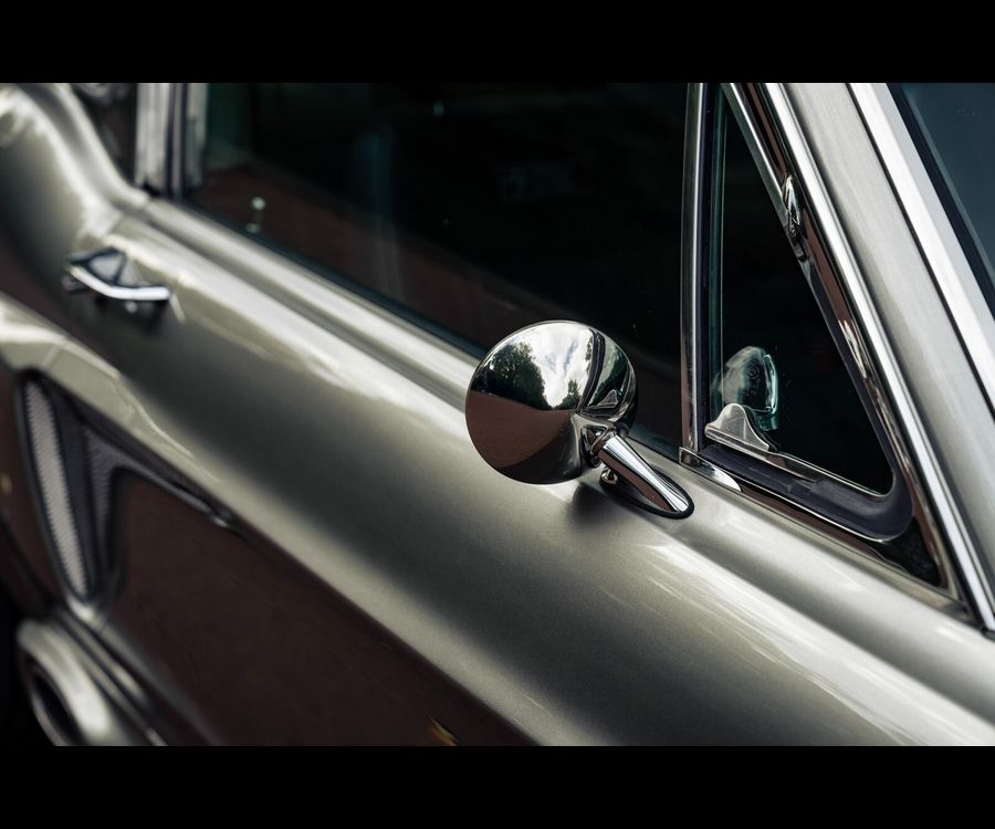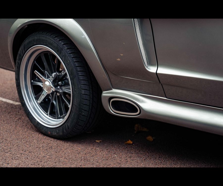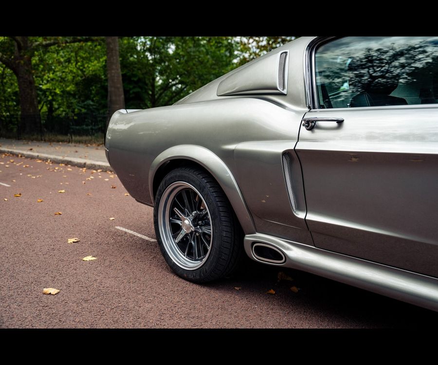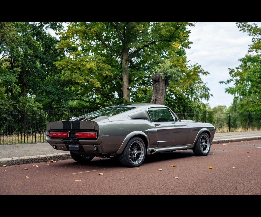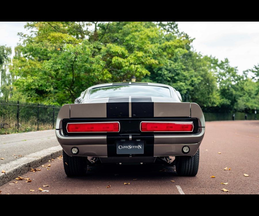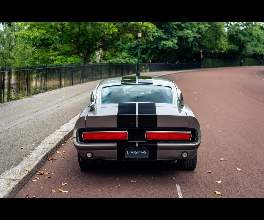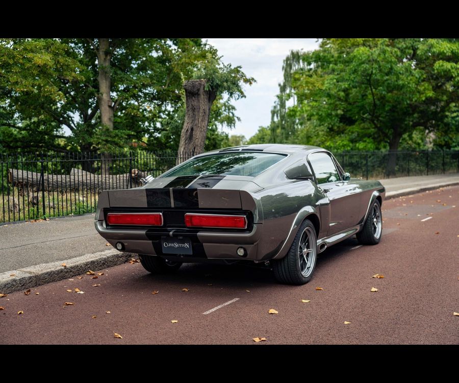 Fully stripped to bare metal and finished in Pepper Grey metallic with black flush-painted racing stripes, this Fastback carries an unmistakable Shelby-inspired presence.