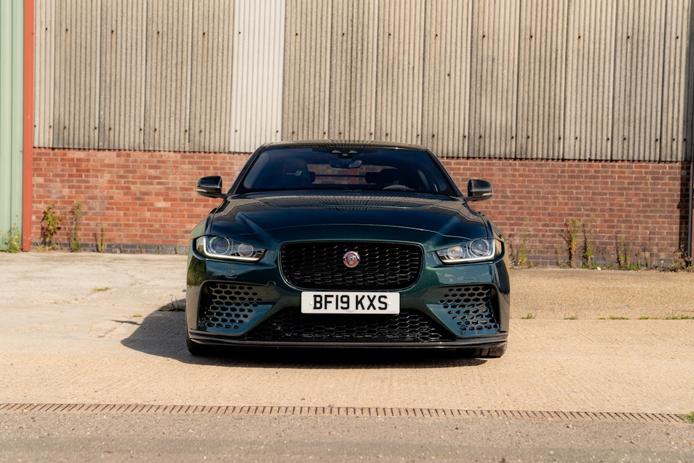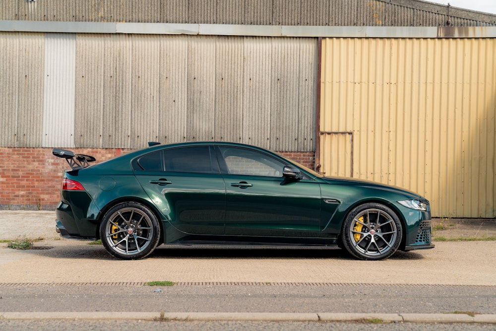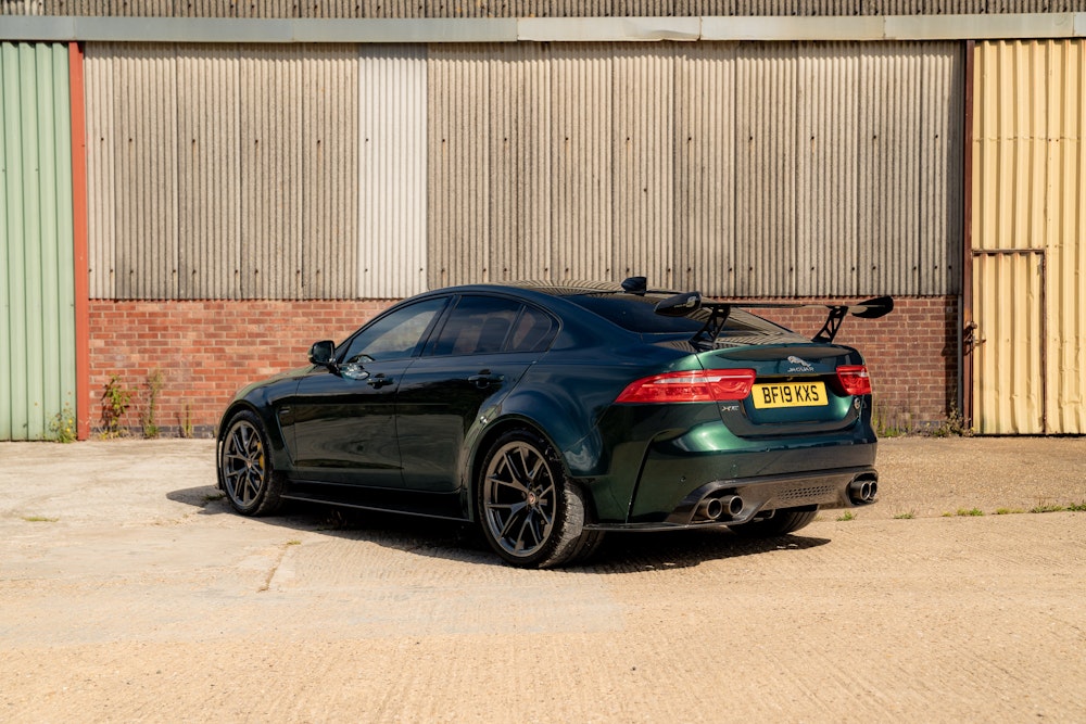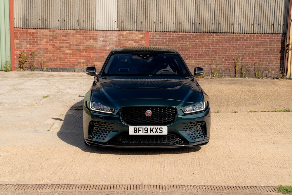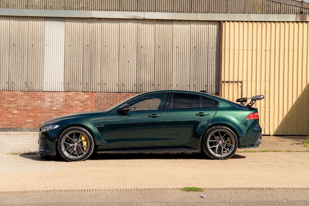 This 2019 Jaguar XE SV Project 8 is a limited-edition performance saloon with 14,201 miles. Finished in SVO Premium Palette Green with a black leather and Alcantara interior, it features carbon-fibre body panels and is covered by an extended warranty until October 2025.
