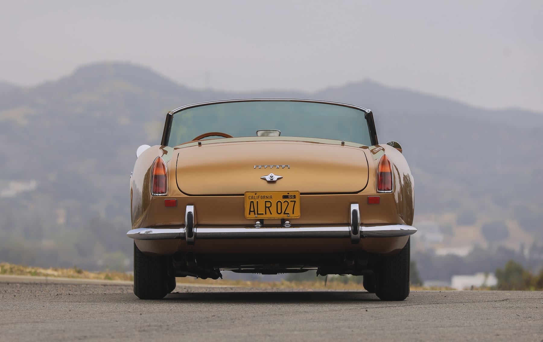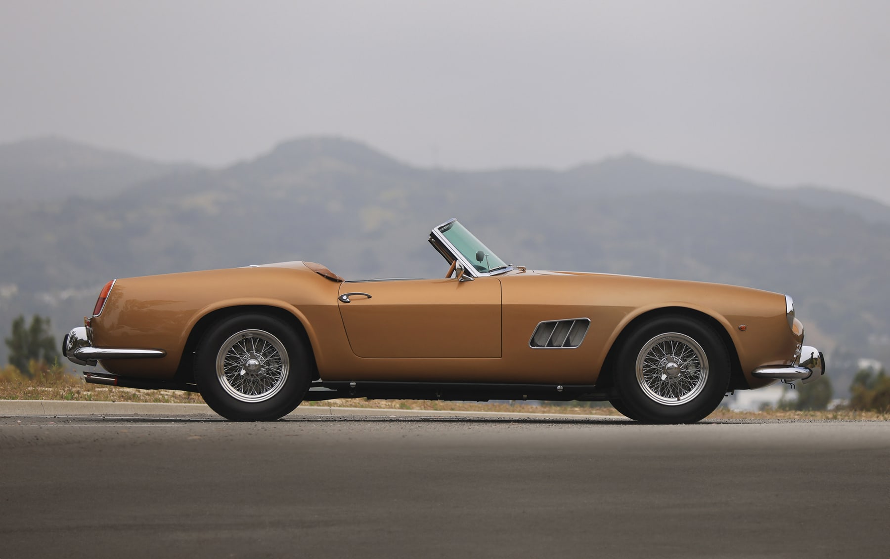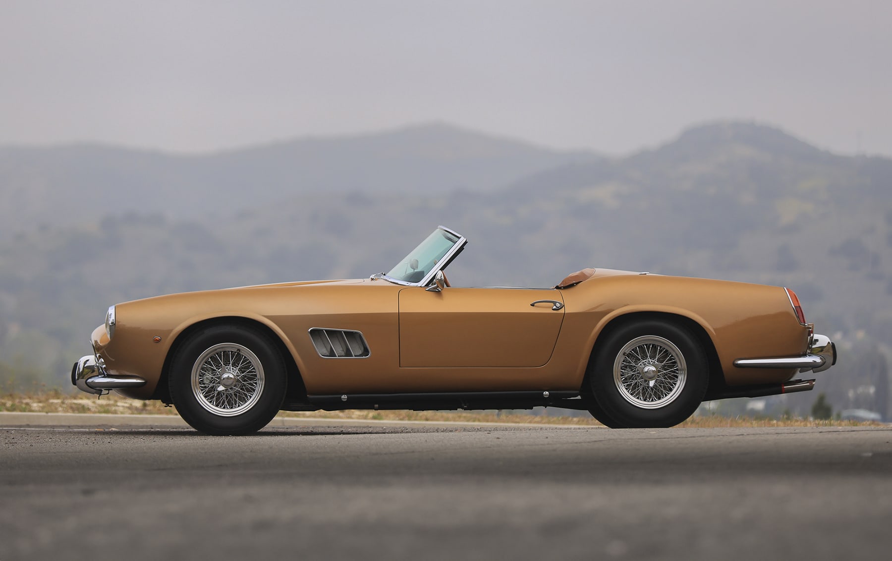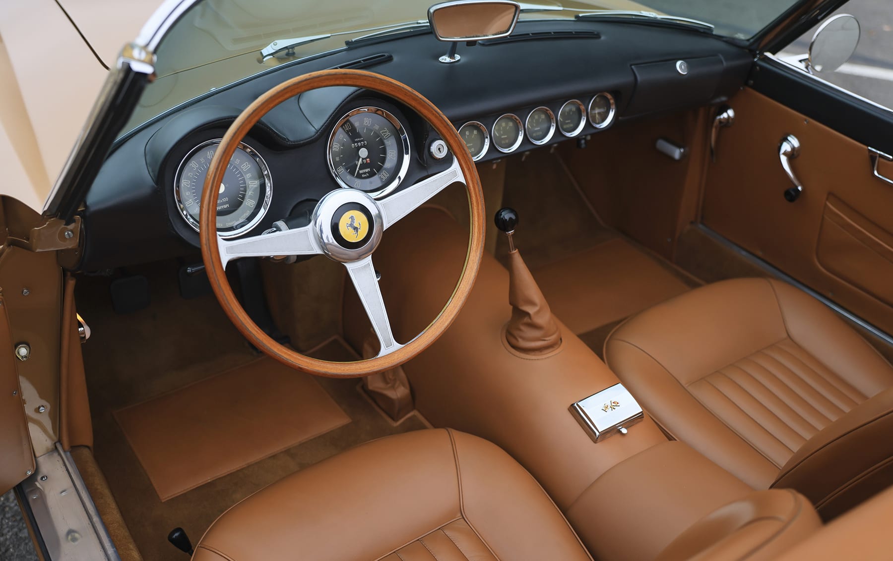 Car Highlights Among the Most Iconic Classic Ferraris – The Short-Wheelbase California Spider Believed to be the Sole Example Originally Finished in Nocciola over Tobacco Delivered New to Noted Milanese Publisher and Ferrari VIP Customer Dino Fabbri Owned by Famed Singer and Actor “Little Tony,” Featured in Several Italian Films Ferrari Classiche Certified; Retains Original Chassis, Body, and Drivetrain Documented by Ferrari Historian Marcel Massini and Archivio Targhe Technical Specs 2,953 CC SOHC Tipo 168/61 V-12 Engine Three Weber 40 DCL6 Carburetors 240 BHP at 7,000 RPM 4-Speed Manual Gearbox 4-Wheel Dunlop Servo-Assisted Disc Brakes Front Independent Coil-Spring Suspension with Tubular Shock Absorbers Rear Live Axle with Semi-Elliptical Leaf Springs and Tubular Shock Absorbers