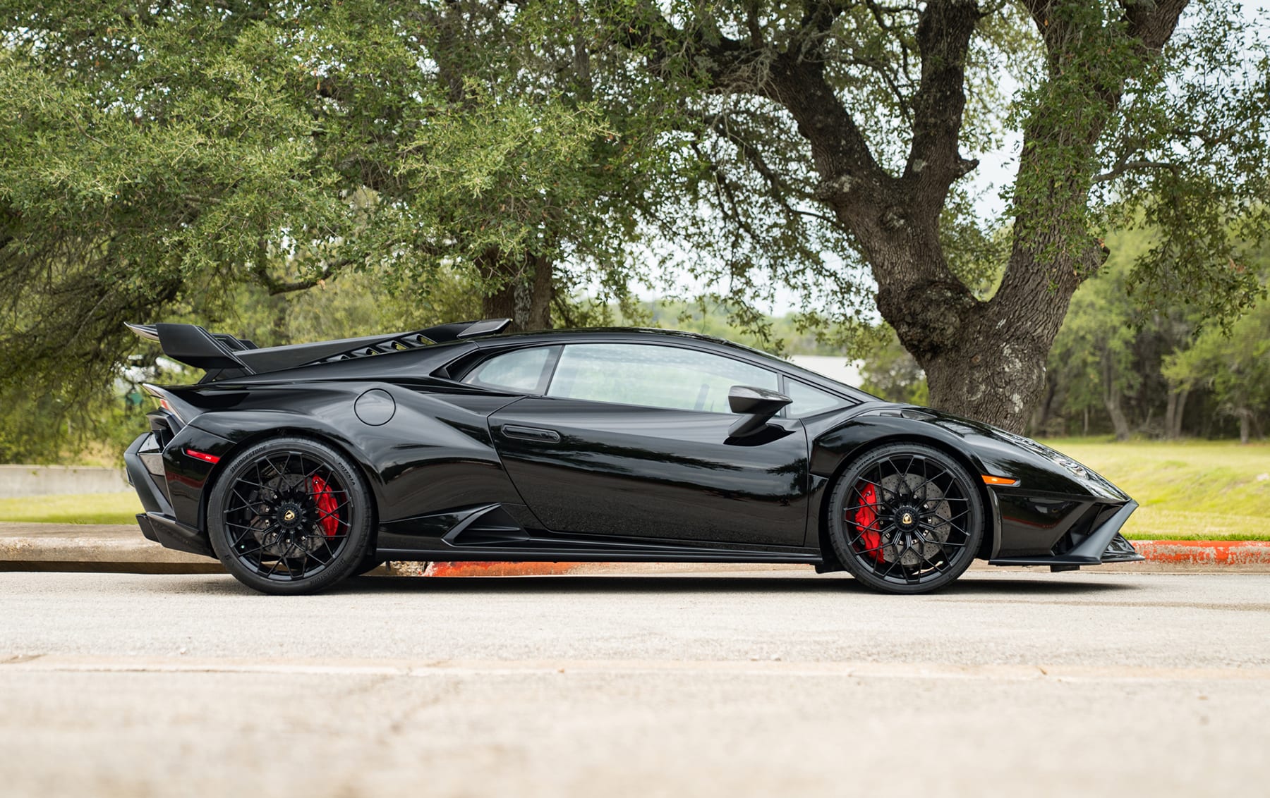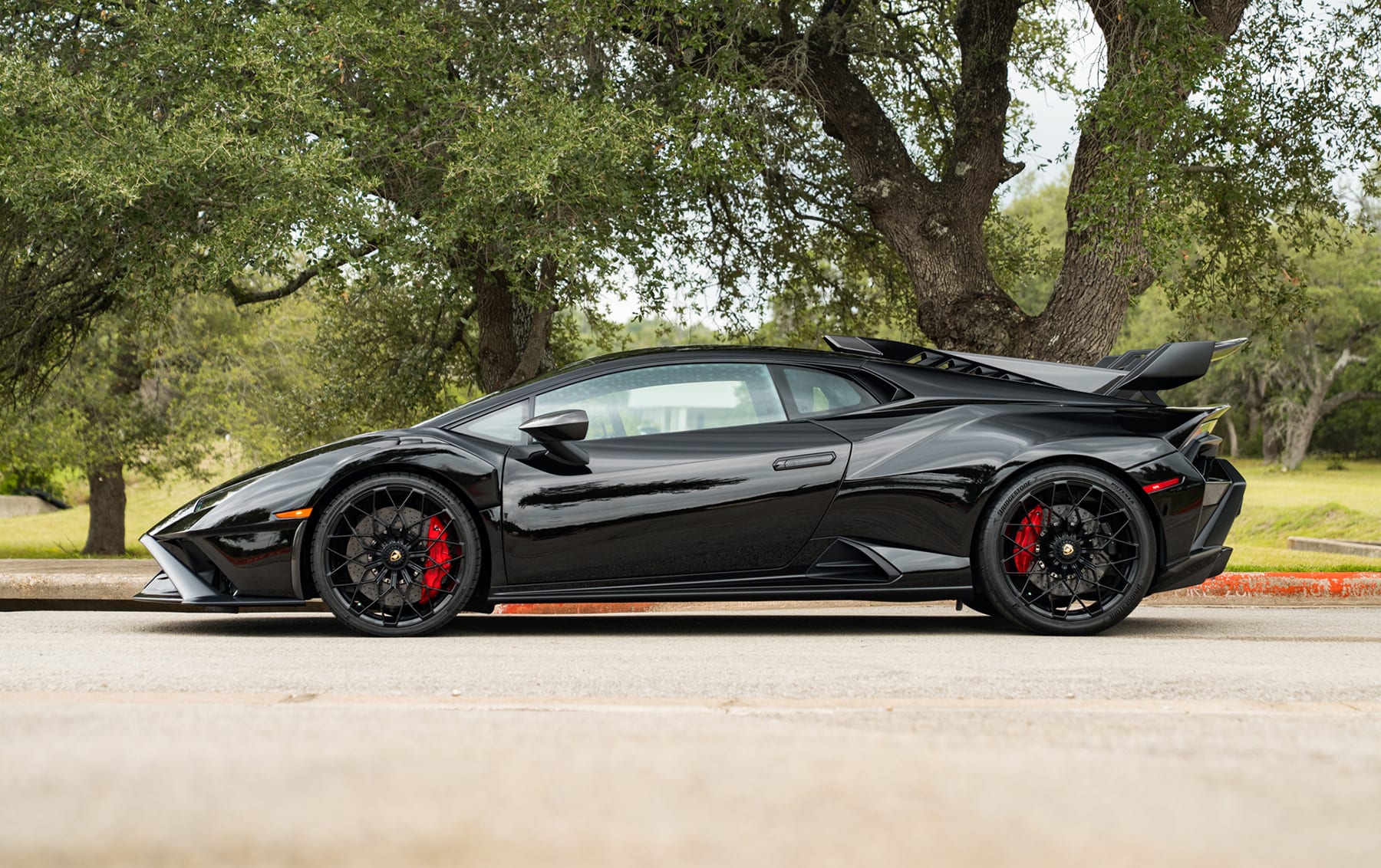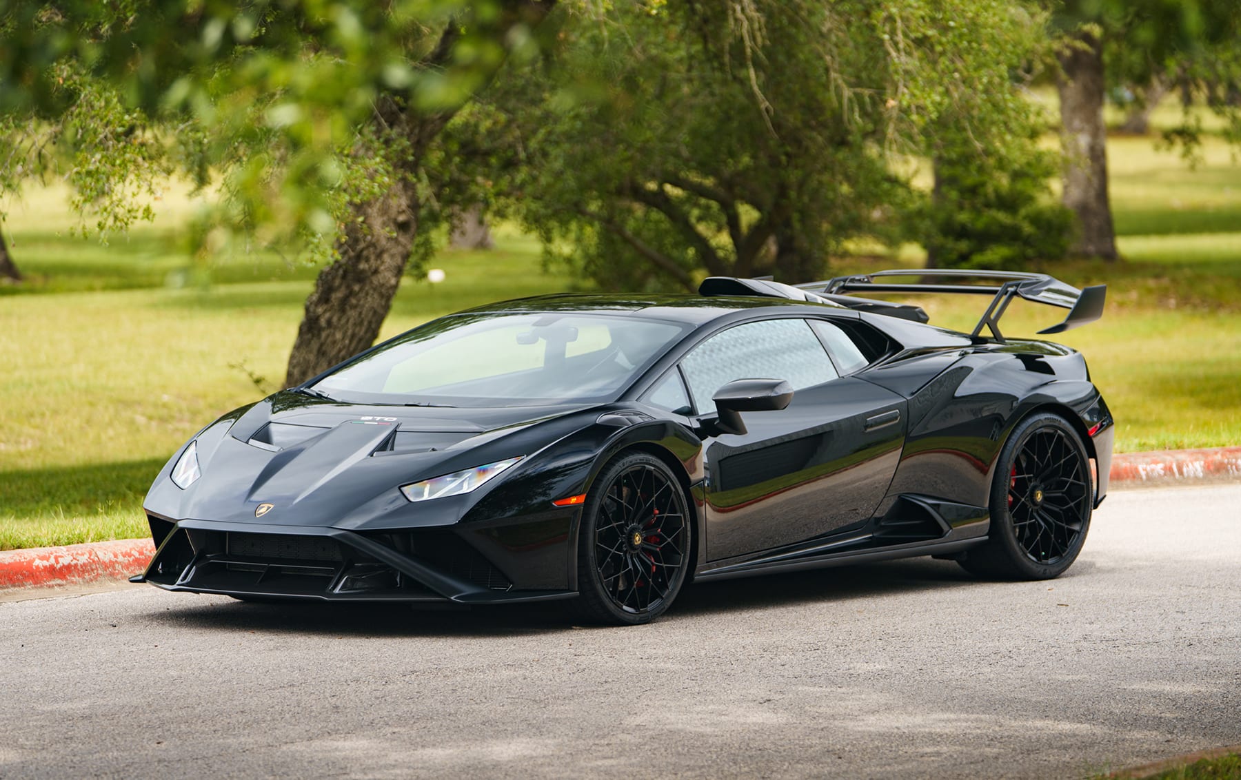 This 2021 Lamborghini Huracán STO is the ultimate track-focused road car. It features a stunning black over black and red color combination, and is powered by Lamborghini’s legendary 5.2-liter V-10 engine.