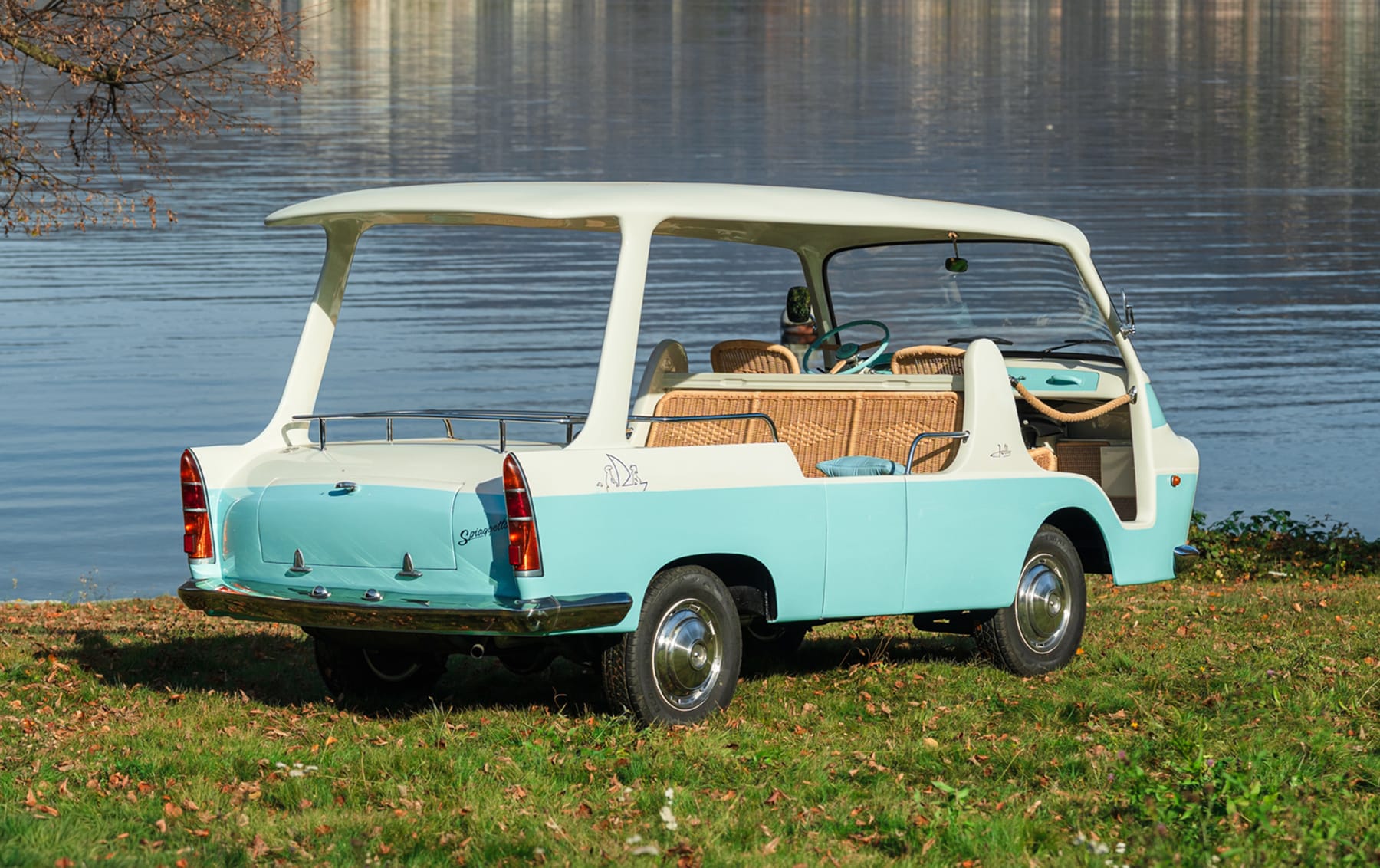 This one-off 1960s Ghia Spiaggetta, based on a Fiat 1100 T2 platform, features a unique design with wicker seating for eight and nautical-themed accents. Offered without a registration certificate, this charming shoreside conveyance embodies la dolce vita.