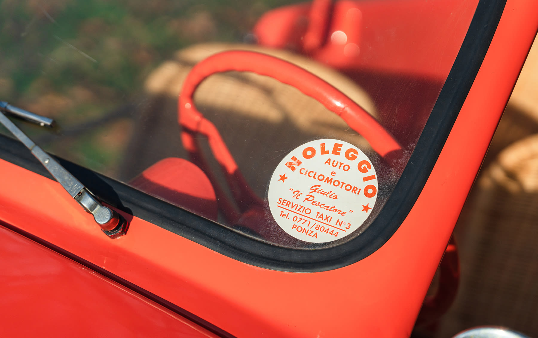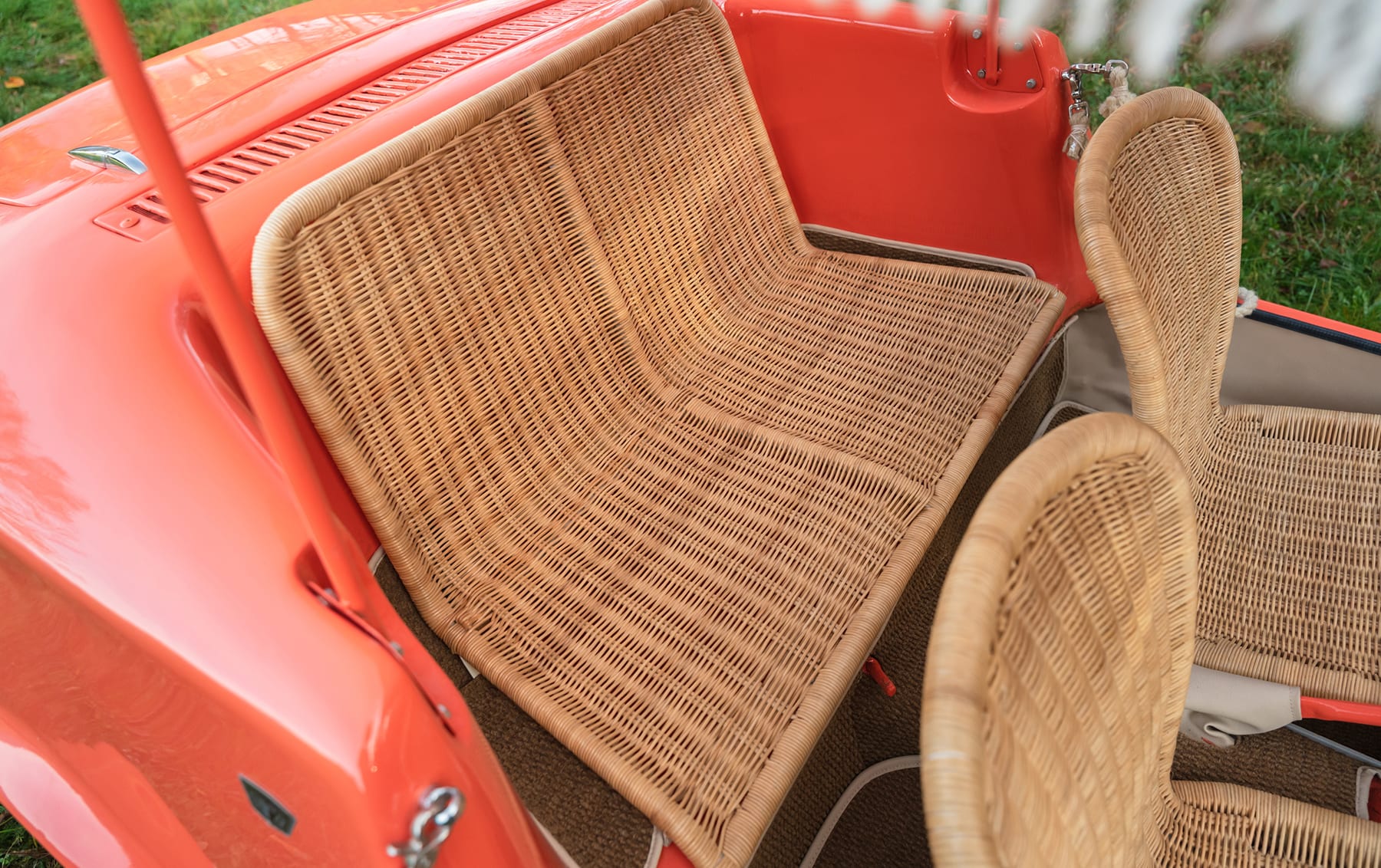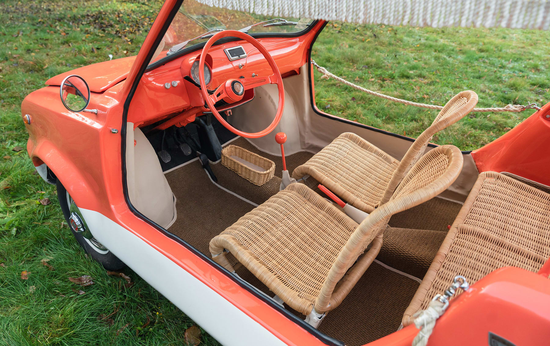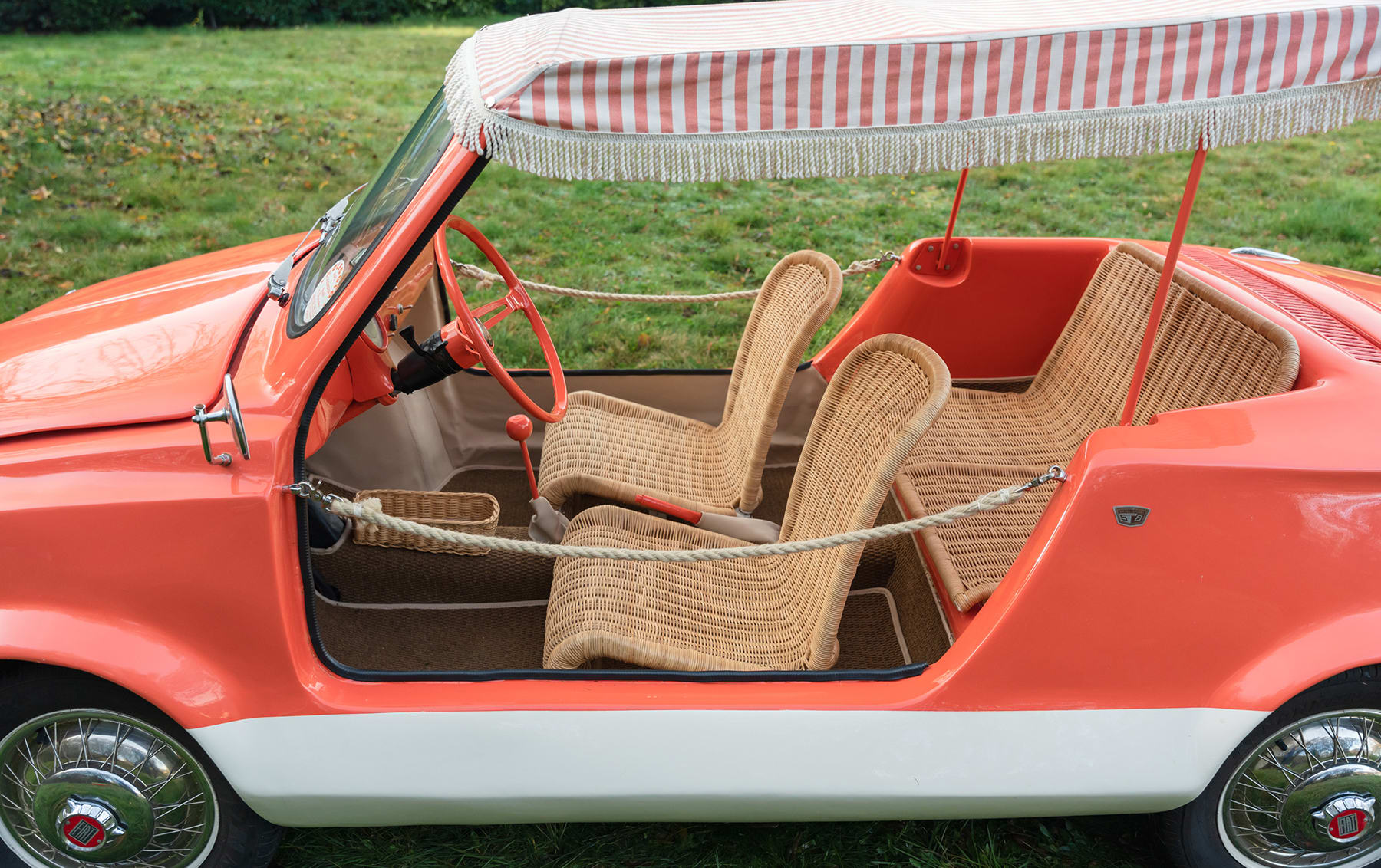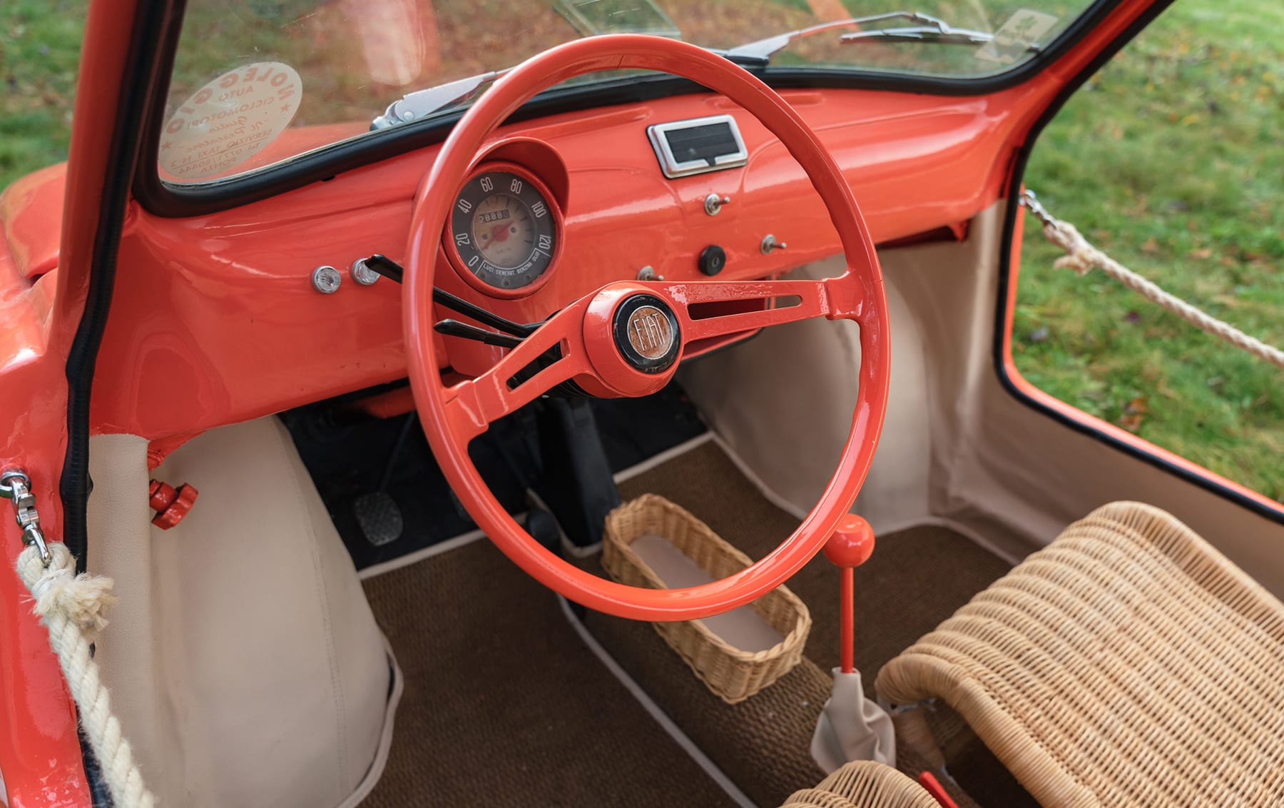 This is a rare 1965 Fiat 500 F Sibona-Basano “Decathlon” Spiaggina, a unique open-sided model with a fiberglass body and wicker seats. Reportedly used as a rental car in 1977, it has been recently restored and evokes a carefree 1960s Riviera lifestyle.