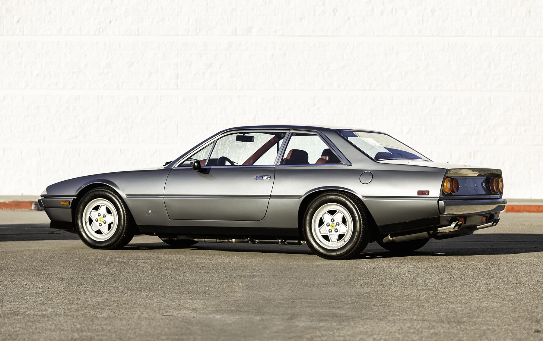 This Ferrari 412, a refined grand tourer with only 576 built, features a 4.9-liter V-12 engine, automatic transmission, and a rare Grigio Metallizzato over red leather color scheme.