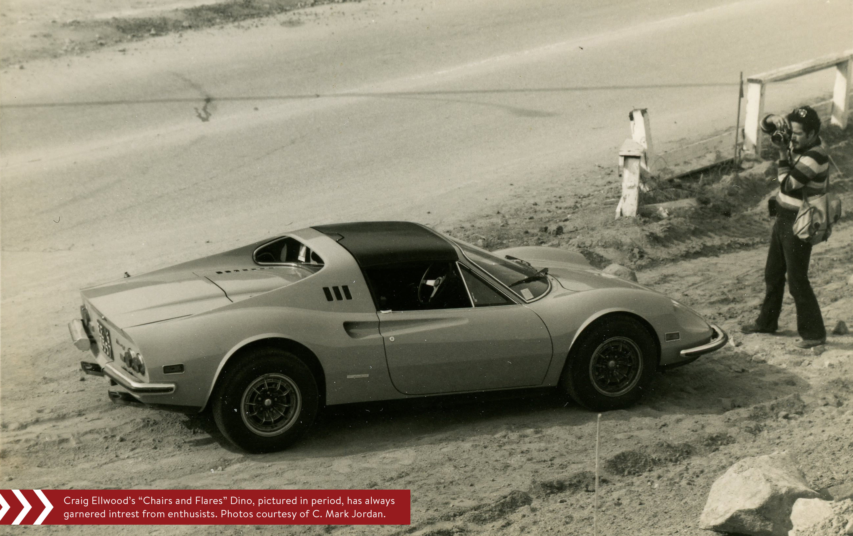 This Ferrari Dino 246 GTS is a unique 'chairs and flares' model, originally delivered in Porsche Signal Orange and owned by architect Craig Ellwood. It's been collector-owned for 25 years and comes with reports and accessories, plus an invitation to the 2026 ArtCenter Design Invitational.