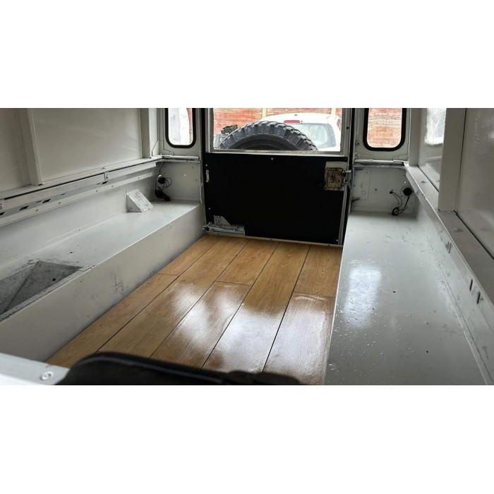 This is a 1985 Land Rover Defender 110 Hard Top, an ex-UN vehicle with only 8000 miles. It has been fully serviced and restored, is rust-free, and features a 5-speed manual transmission and black leather interior.