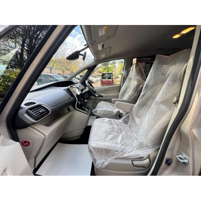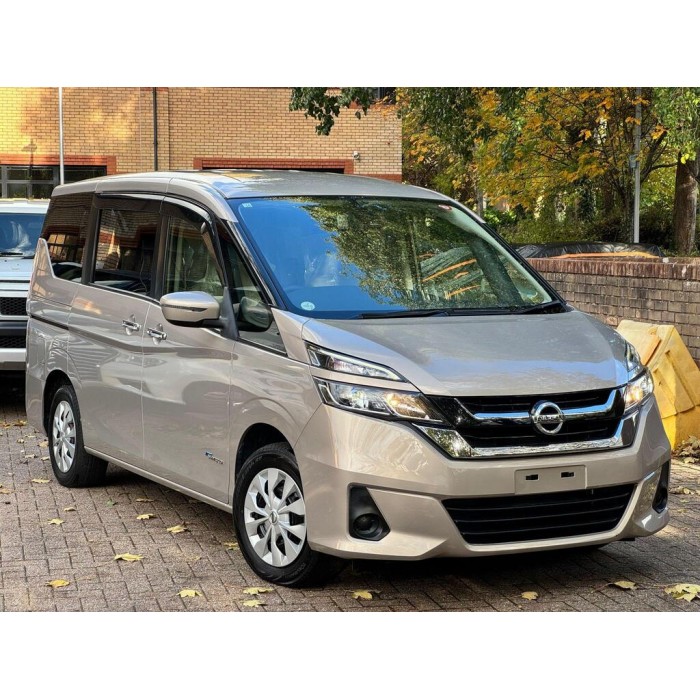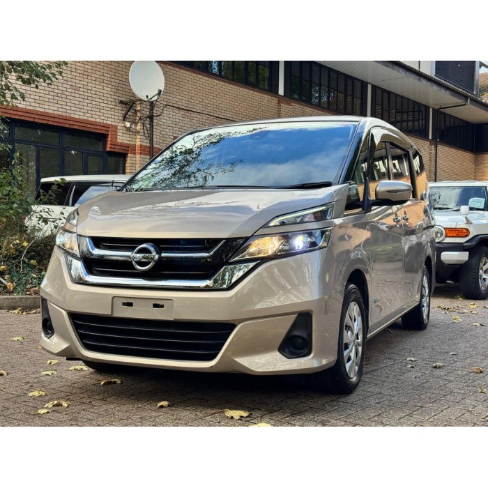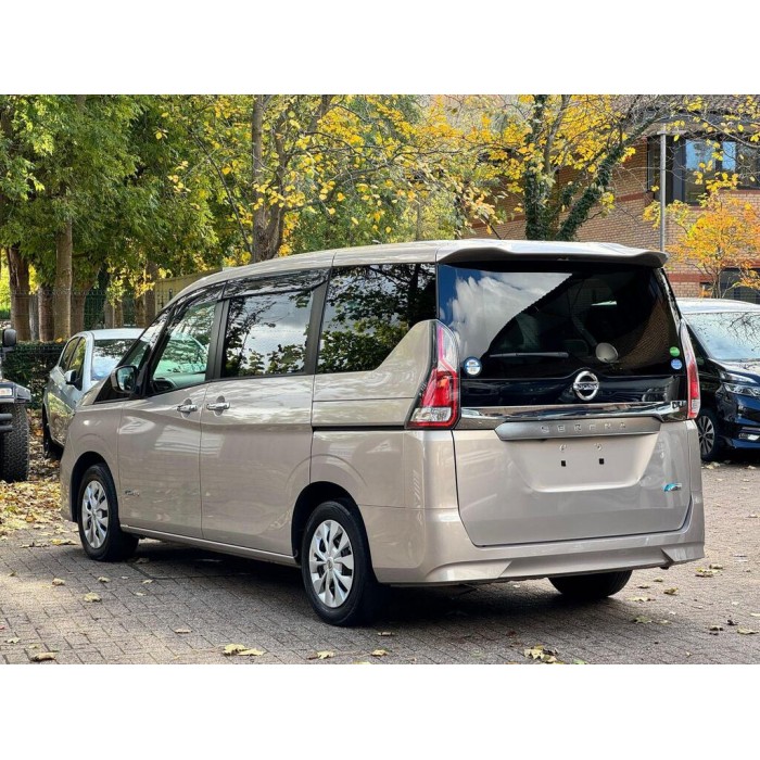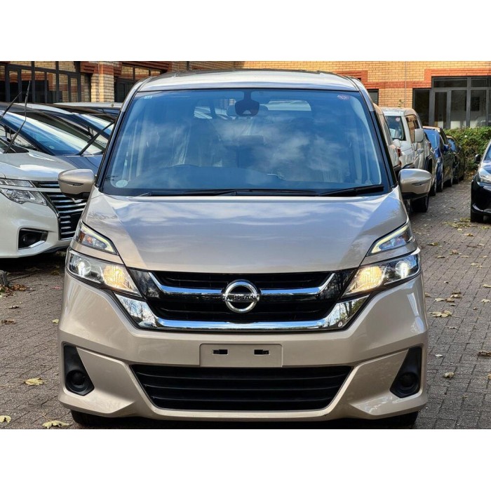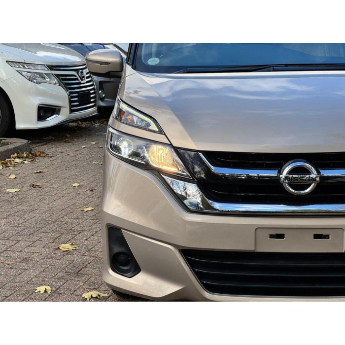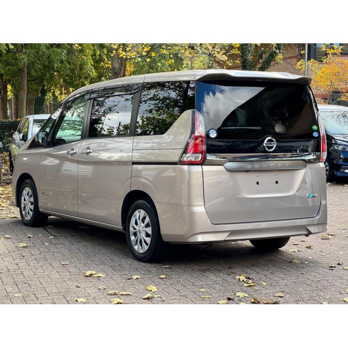 This is a 2016 Nissan Serena, a fresh Japanese import with low warranted mileage. It features beige 8 seats, metallic gold paint, electric doors and a UK stereo system, sold with 18 months warranty.