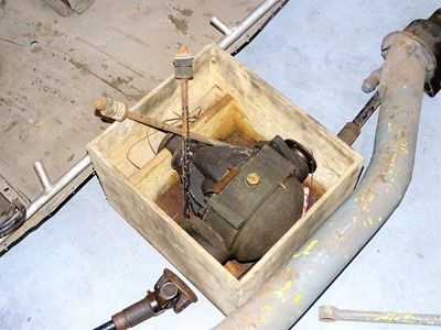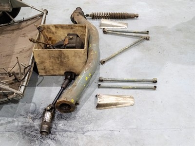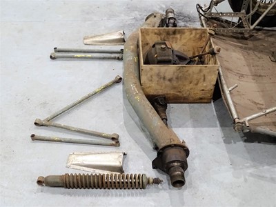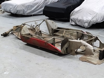 The car is a collection of parts, including a chassis frame, engine, gearbox, and differential. The front chassis section is missing, and the floor and sponsons are zip-tied to the chassis frame for display purposes. The car requires significant restoration to be in running condition.