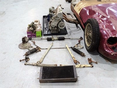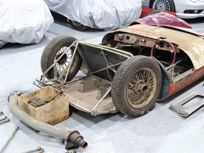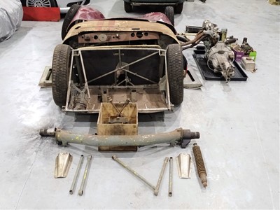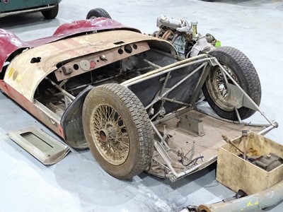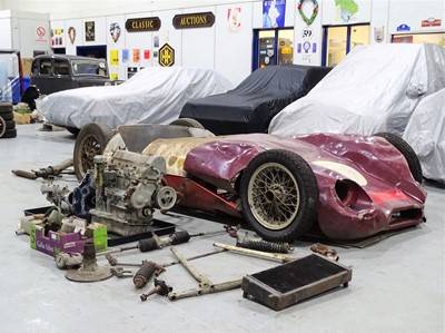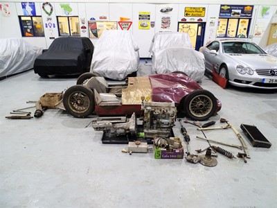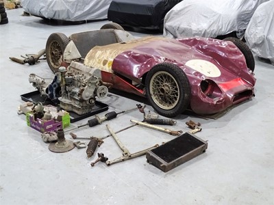 This listing is for a c.1956 Lotus Eleven Series 1 project. It includes a chassis frame, Coventry Climax engine, MOWOG gearbox, and rear differential, but is missing the front chassis section and requires substantial reconditioning.