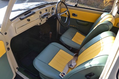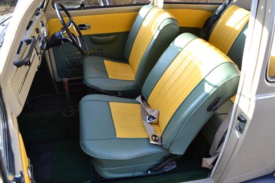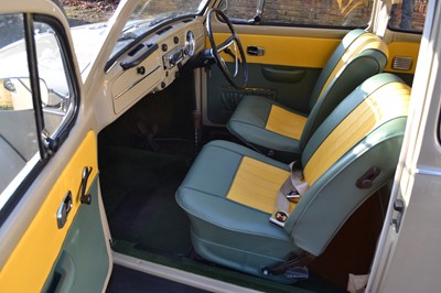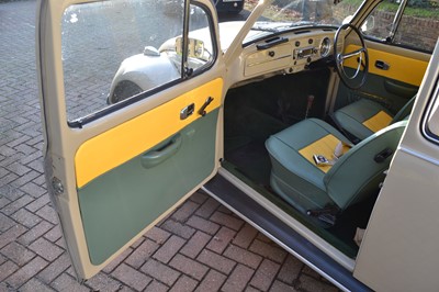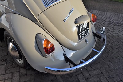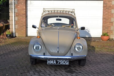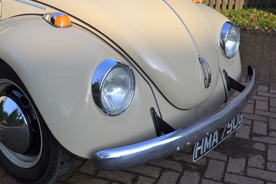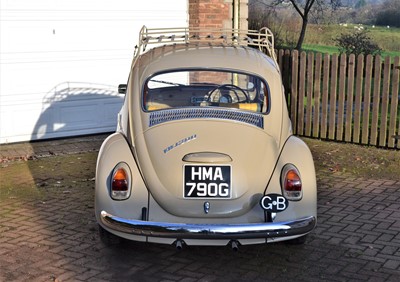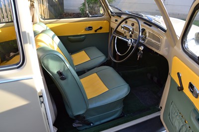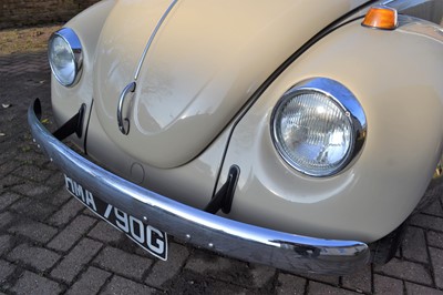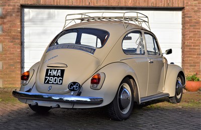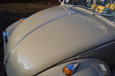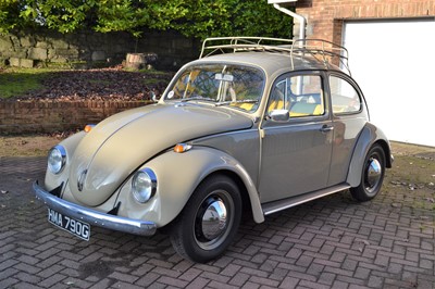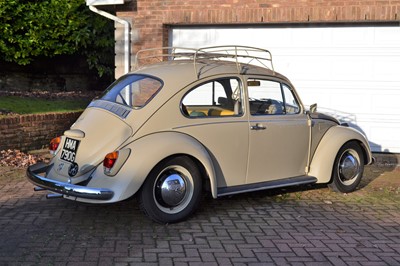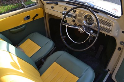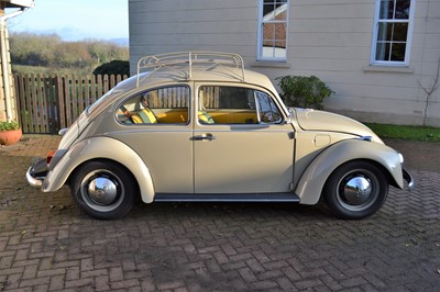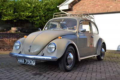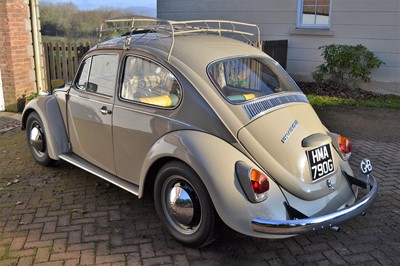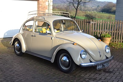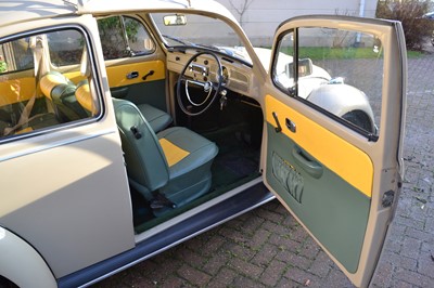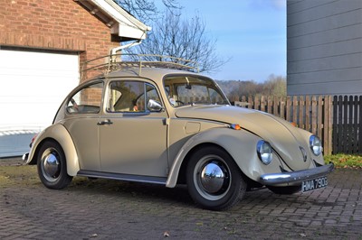 This 1968 Volkswagen Beetle 1300, finished in Sevenna Beige with a green and yellow interior, was comprehensively restored around 2014 and has been sparingly used since. It features a 1285cc flat-four engine, four-speed gearbox, disc brake conversion, and comes with an extensive history file including its original service record and numerous MOT certificates.