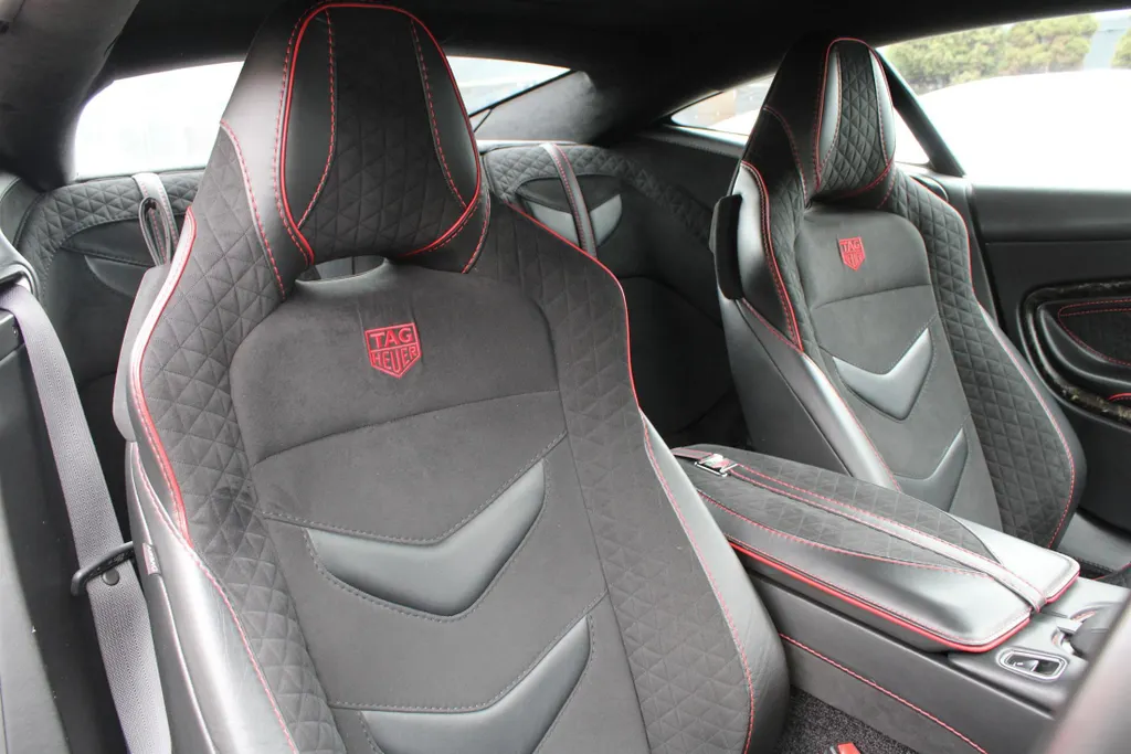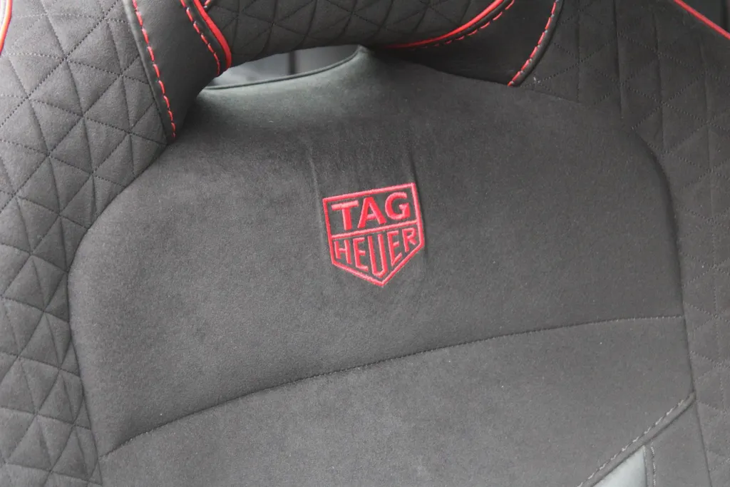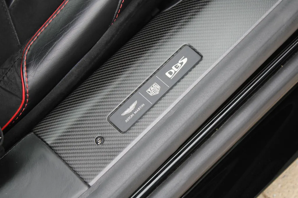 This is an Aston Martin DBS Tag Heuer Edition, one of only 50 made. It features Monaco Black exterior, Pure Black Leather Interior with Spicy Red Stitching, Bang & Olufsen audio, and Machined Carbon.