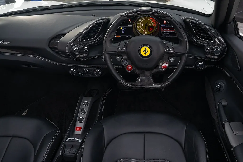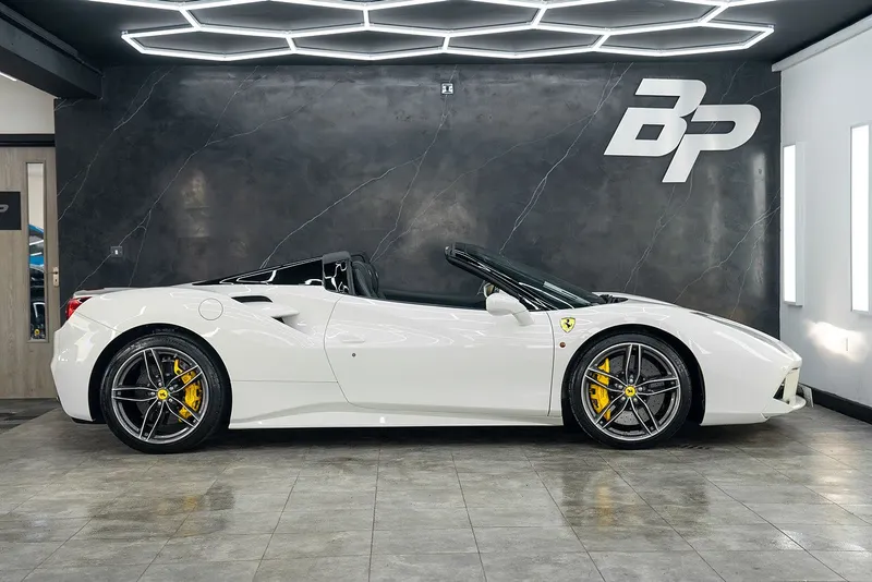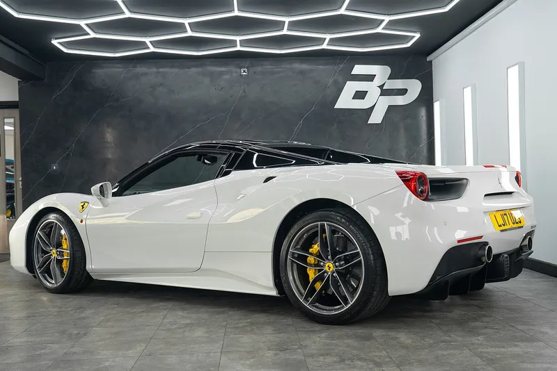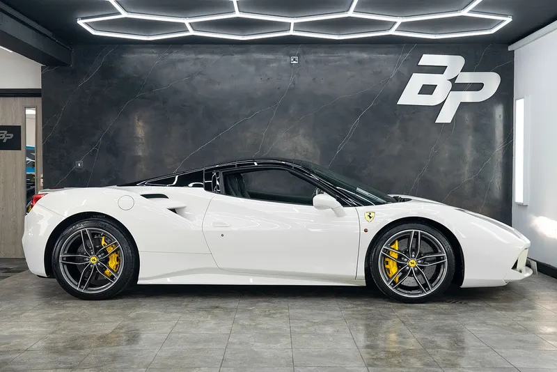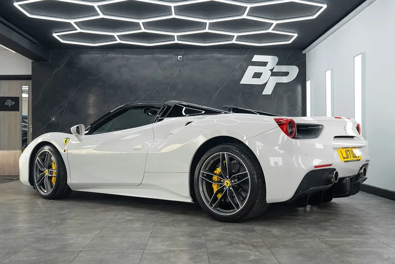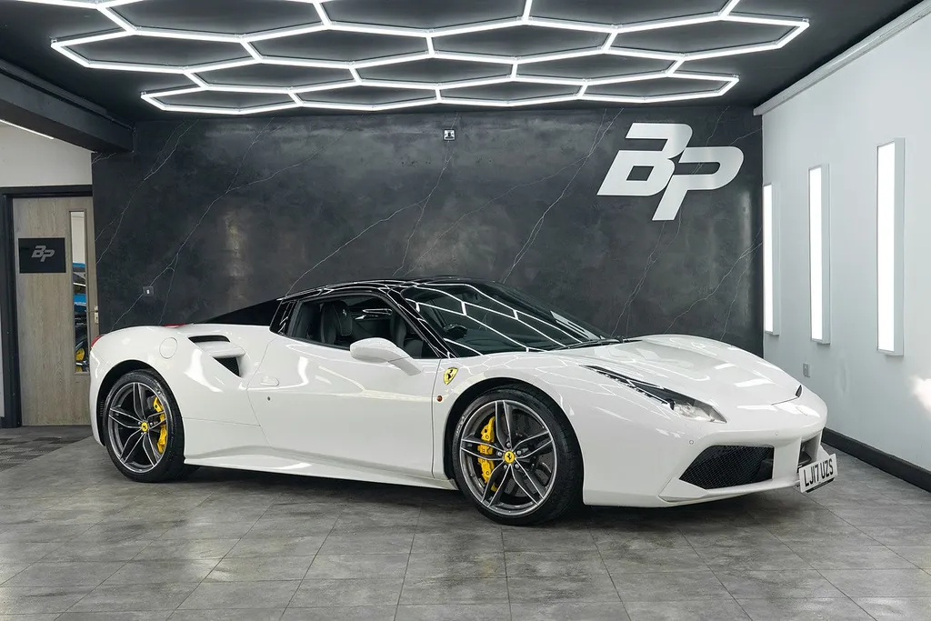 This 2017 Ferrari 488 Spider is finished in Bianco Avus with a Nero interior and has 20,500 miles. It's a twin-turbo V8 convertible, offering everyday usability with supercar performance.