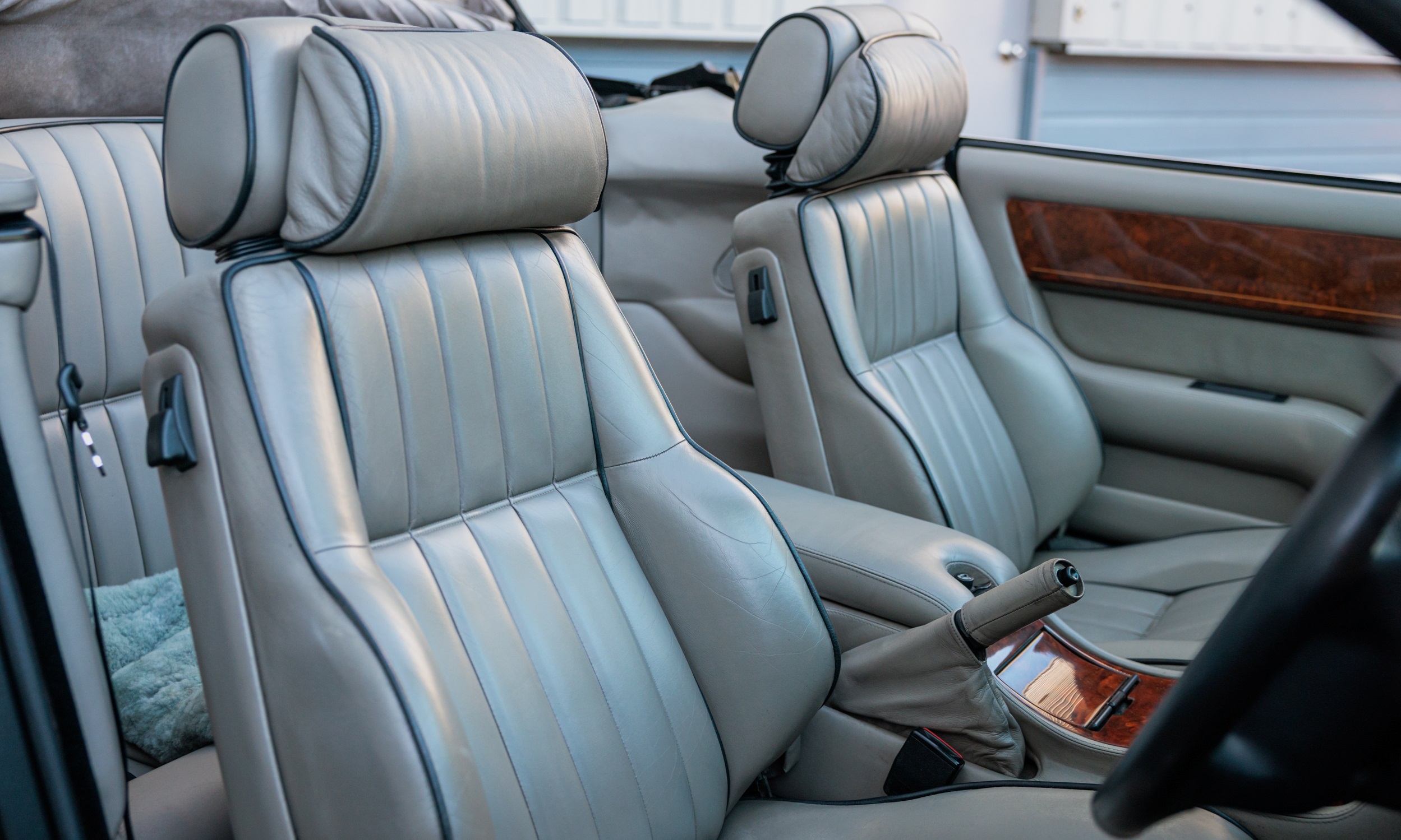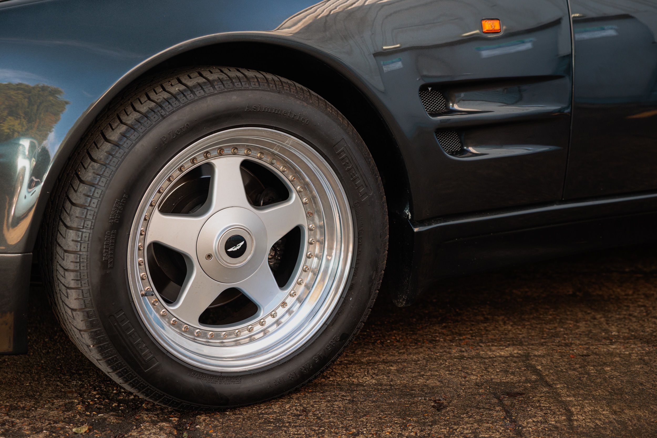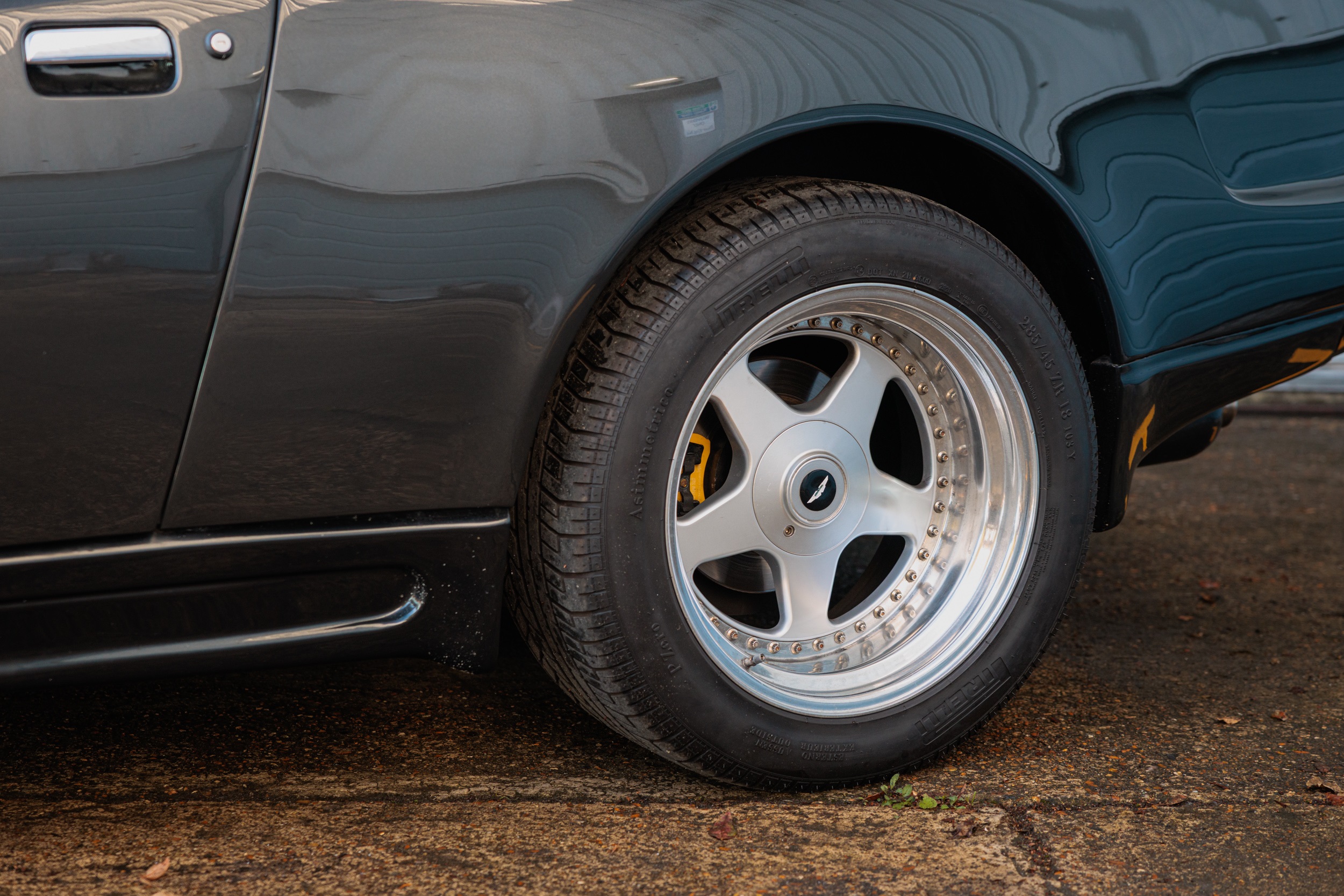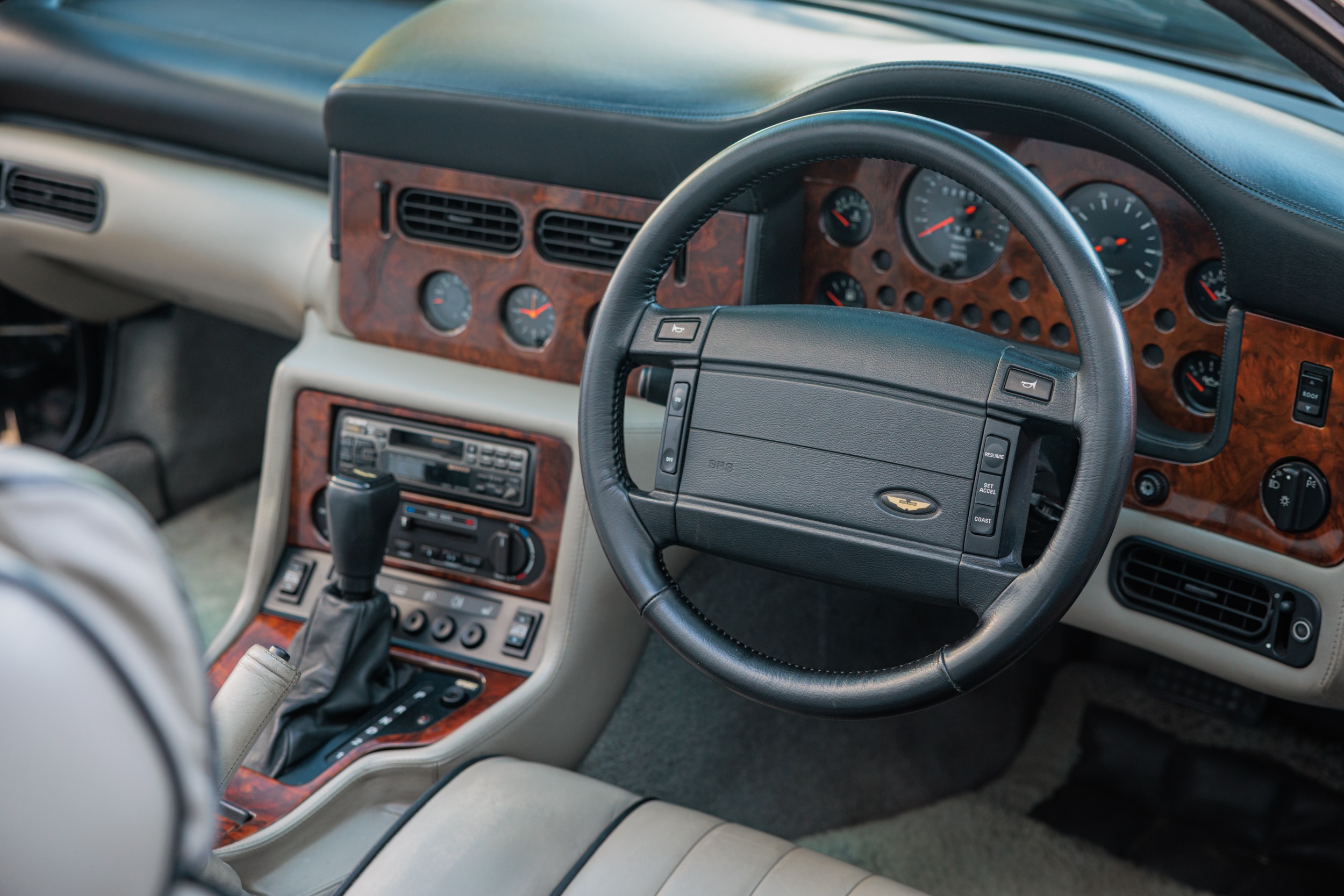 This 1994 Aston Martin Virage Volante 'Cosmetic Widebody' is a rare, well-maintained example with a full matching engine, gearbox, and chassis. It features a desirable Litchfield metallic black exterior, Mushroom hide interior, and a host of factory enhancements, including a sports exhaust system and OZ wheels, supported by a comprehensive history file and recent servicing.