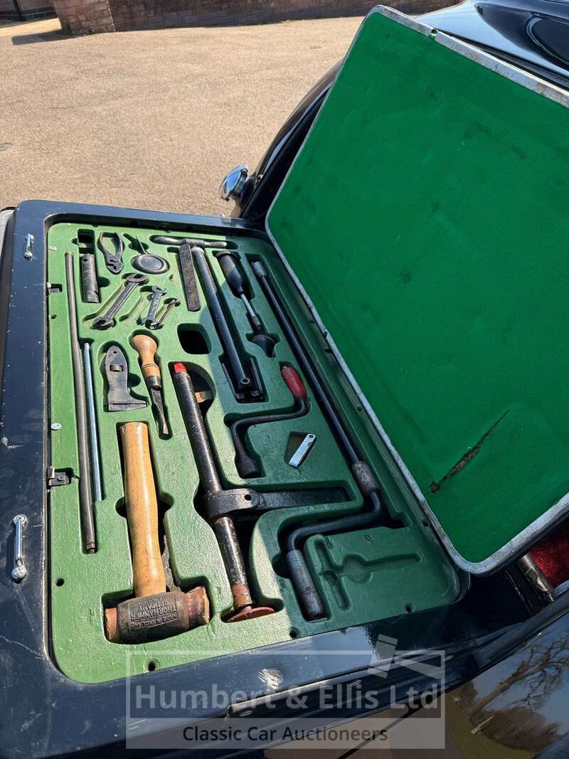 This 1947 Jaguar Mk IV has undergone extensive restoration and is complete with its original toolkit. It features a black exterior, red interior, and a 3500CC engine with manual transmission.