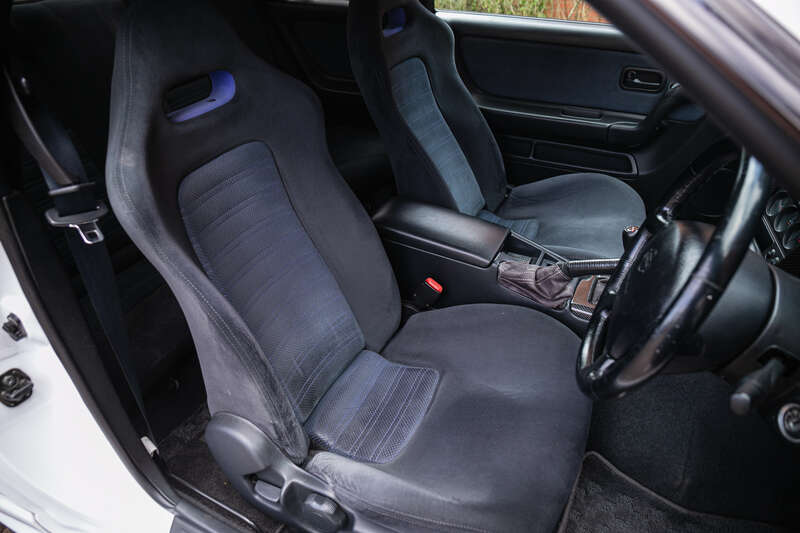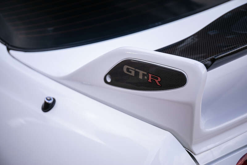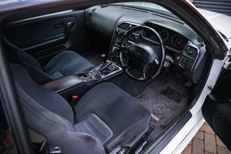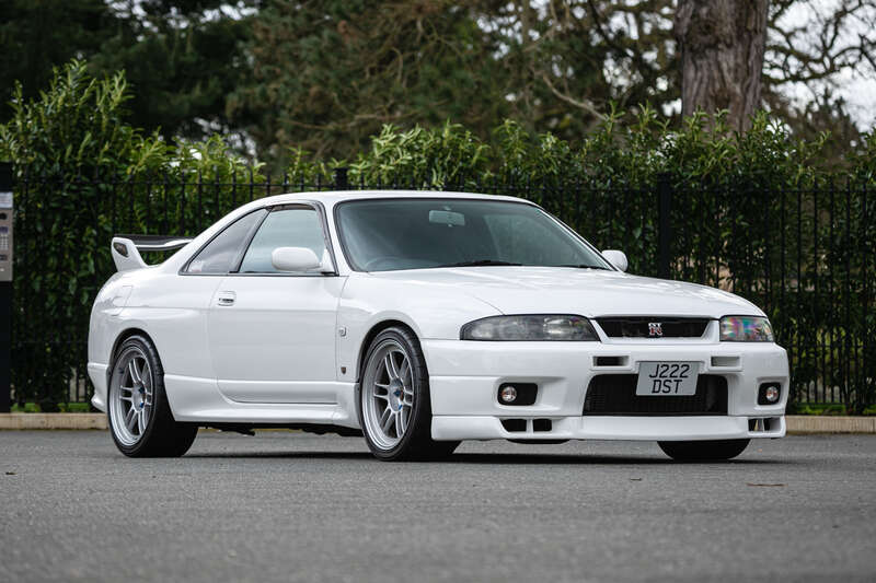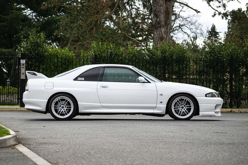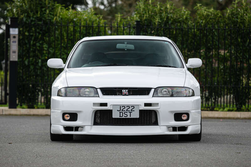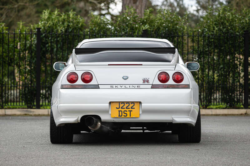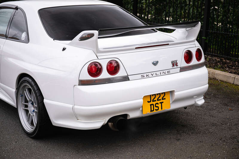 This 1995 Nissan Skyline GT-R (R33) is finished in Motorsport White with a grey interior. It features sympathetic modifications, including RHD Japan downpipes and a Blitz Nur Spec exhaust, while retaining its original turbos on factory settings.