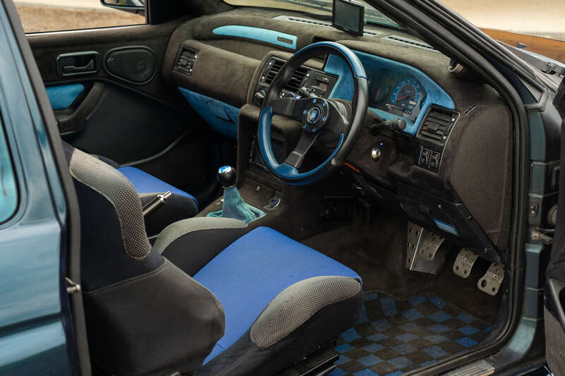 This 1994 Ford Escort RS Cosworth, imported from Japan, features a Mallard Green exterior, a customized black and blue interior, and performance upgrades. With 28,100 miles and recent maintenance, it's a desirable model, though it may exhibit slight wear.