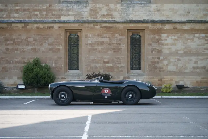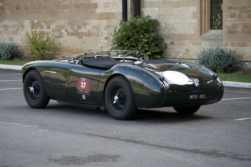 This 1954 Austin-Healey 100/4 BN1 is a fast-road car with rally credentials, featuring a 100M-spec engine rebuild by JME Healeys, BN2 4-speed gearbox, disc brake conversion, and a comprehensive history file.