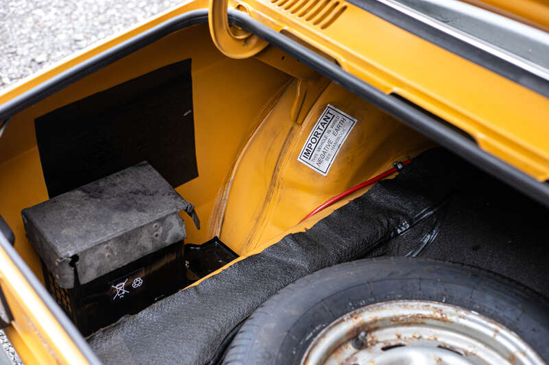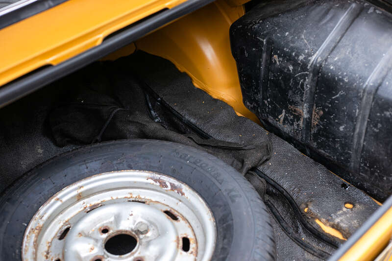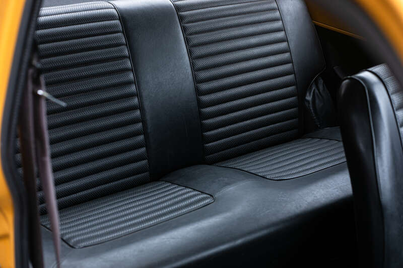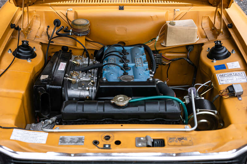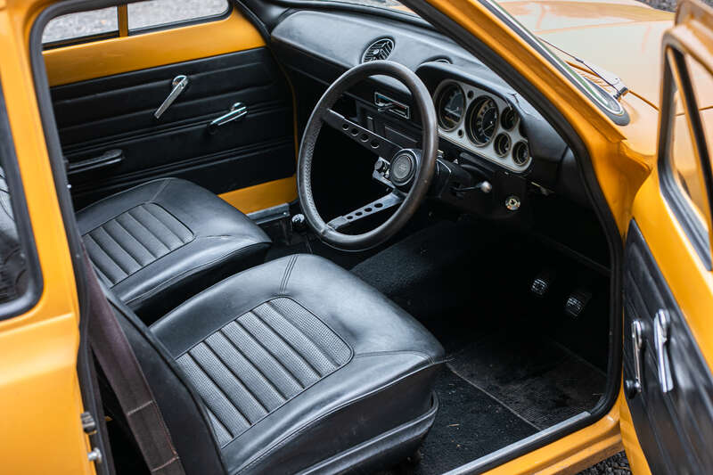 This 1971 Ford Escort Mk1 RS1600 is an ex-Press car with aluminium body panels, restored to look 'untouched' with a worn aesthetic. It features a Maize Yellow body color, manual transmission, and retains original interior elements, including seats and a six-dial instrument cluster.