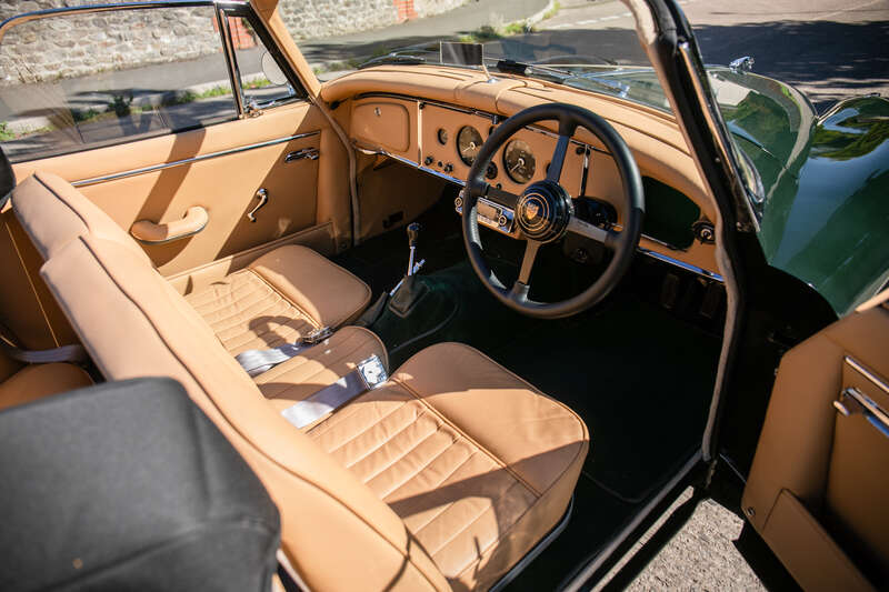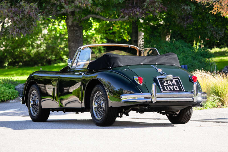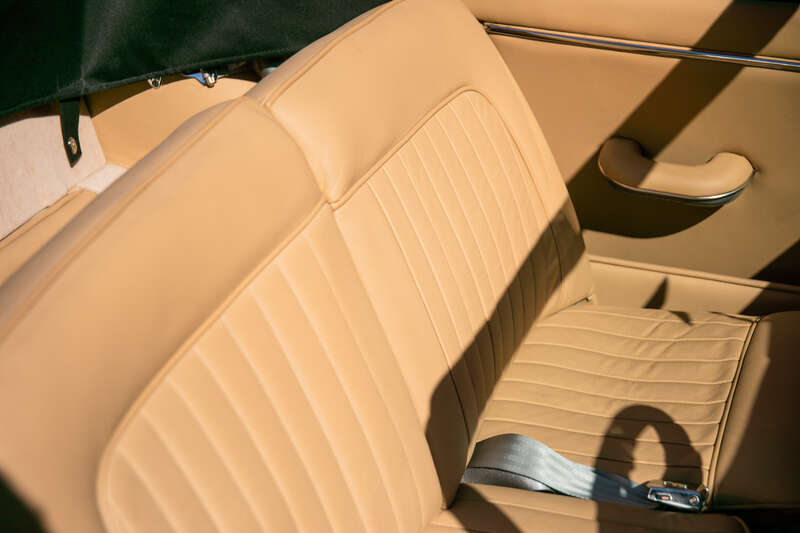 This 1959 Jaguar XK150 SE Drophead Coupé has undergone a thorough restoration with upgrades including a 'S'-specification engine and overdrive. It features a period-perfect British Racing Green exterior, Biscuit leather interior, and comes with extensive documentation, making it a highly desirable classic.