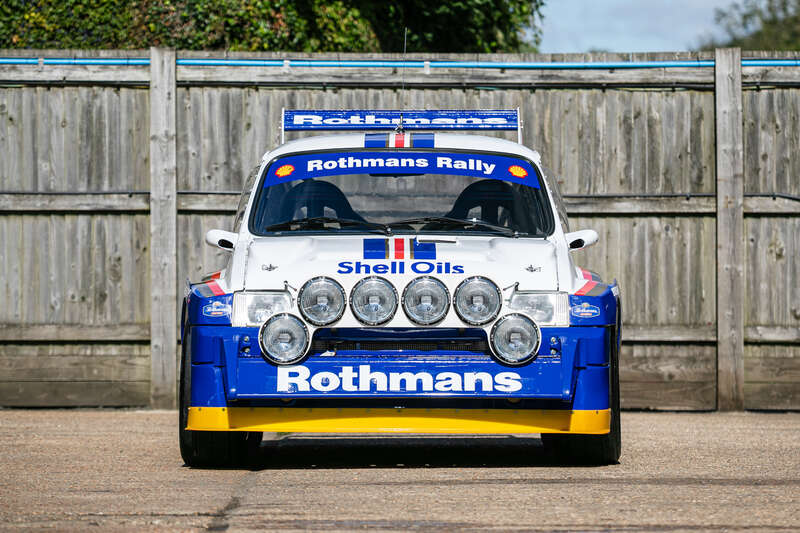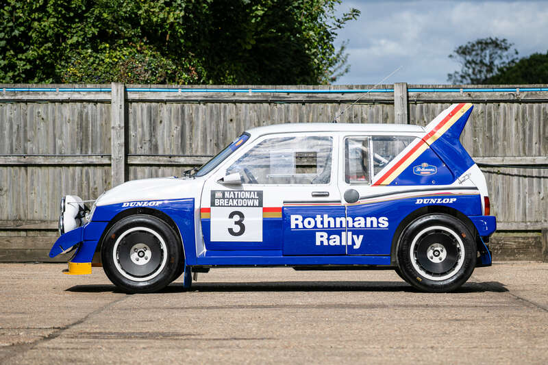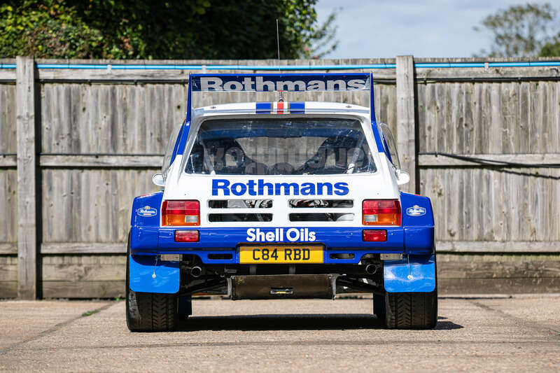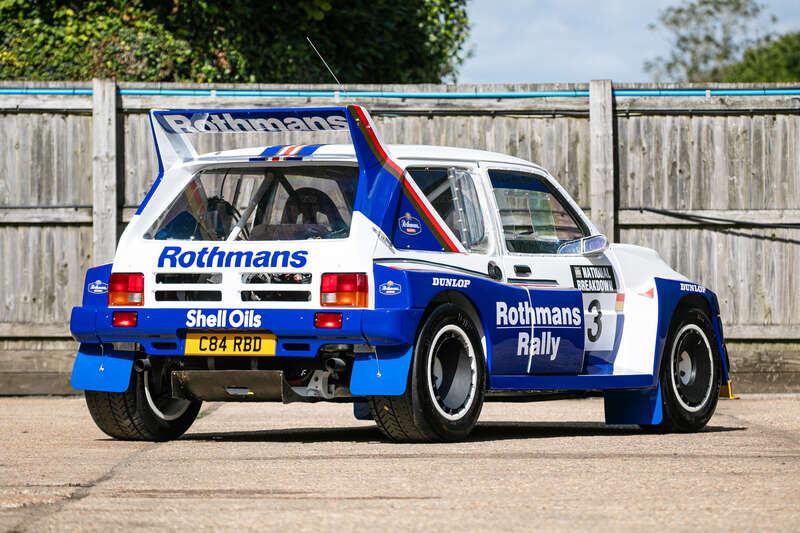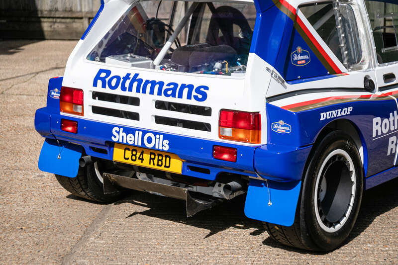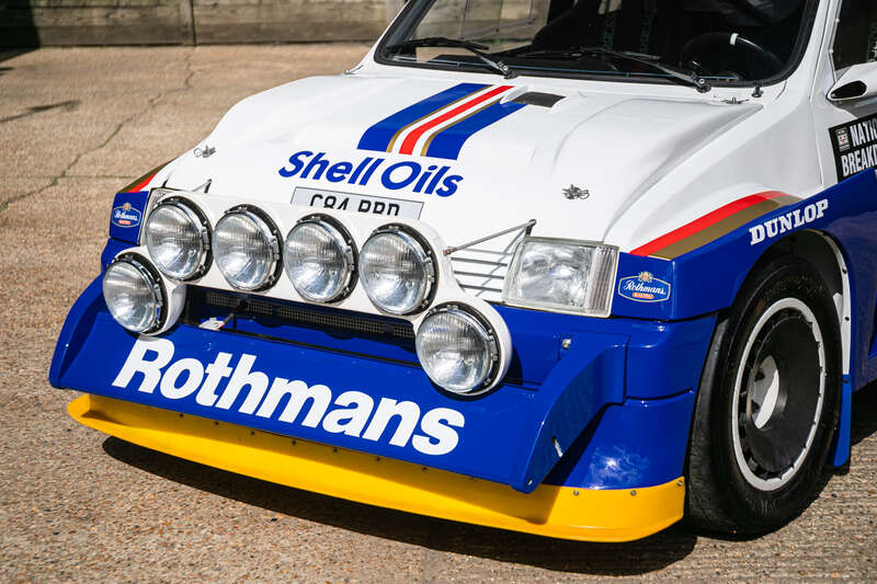 This is a genuine 1985 MG Metro 6R4, chassis #091, with a rich history in Group B rallying, including participation in the 1986 Rally of 1000 Lakes. It features a Works engine (410bhp), dog box, and iconic Rothmans livery and comes with a large history file, making it a significant piece for collectors and enthusiasts.