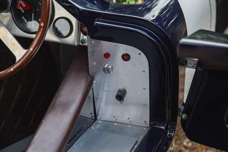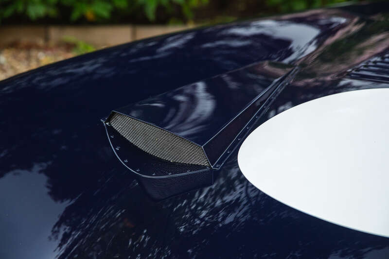 This 2022 Realm 'C-Type' is a well-executed homage to the classic Jaguar Le Mans racer, featuring a Ford Midnight Blue exterior and brown leather interior. It's powered by a rebuilt 4.2-liter Jaguar XK engine and benefits from modern mechanical upgrades, making it a dependable and refined driving experience.