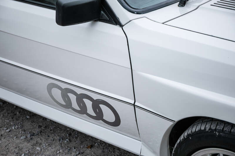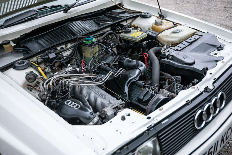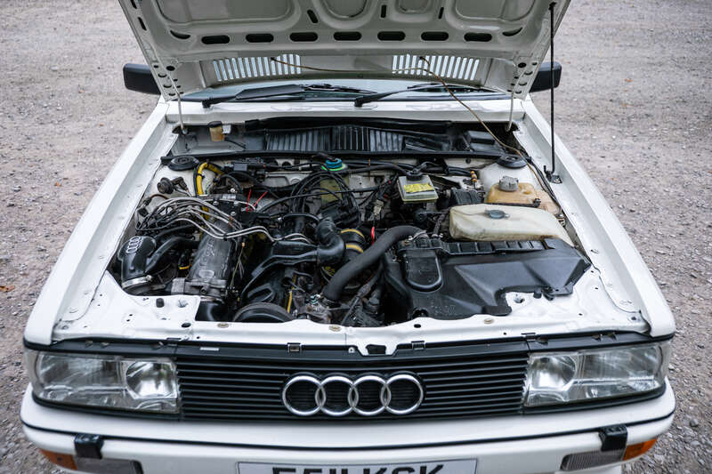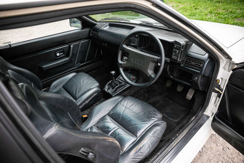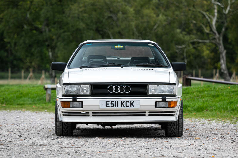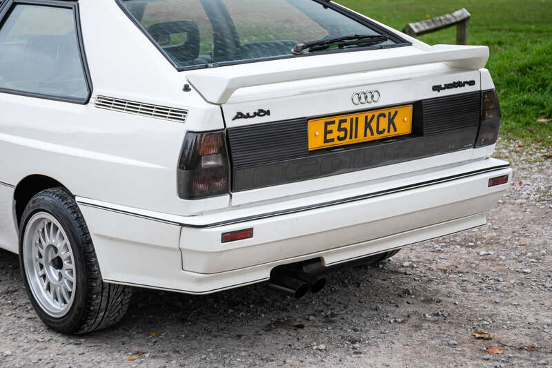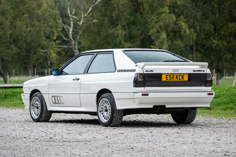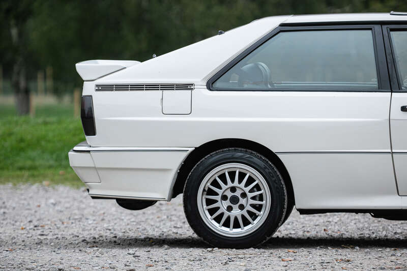This 1988 Audi Quattro MB, the rarest variant, has been recommissioned after 15 years in storage and is finished in Alpine White with black leather. It features a 2.2-litre turbocharged engine, 5-speed manual gearbox, and a Torsen differential, with some welding and paint work completed during the recommissioning.
