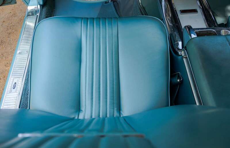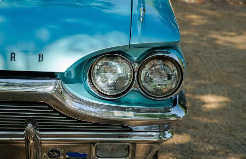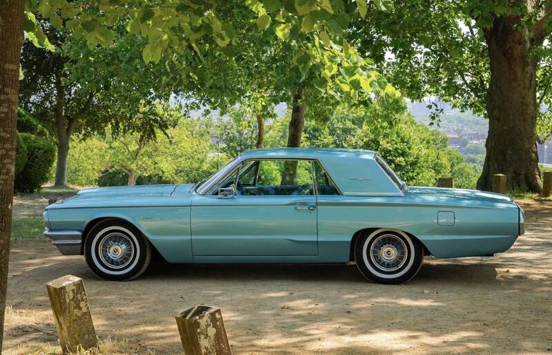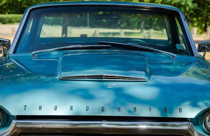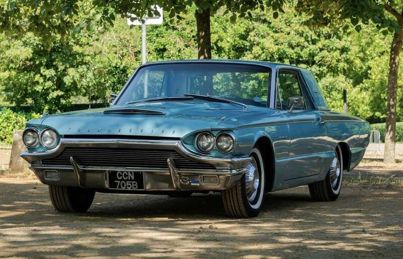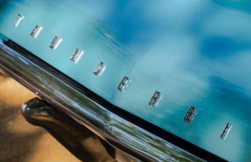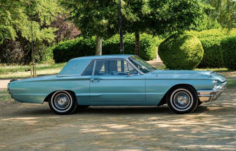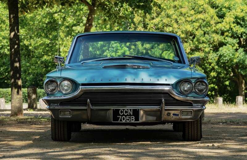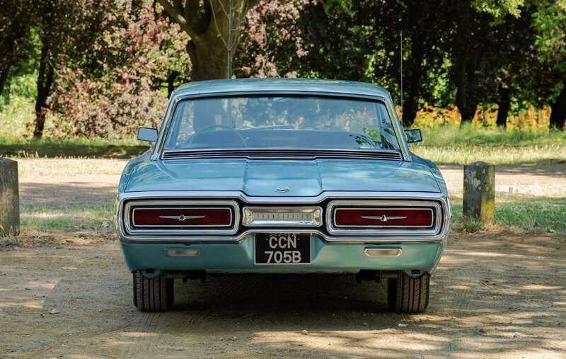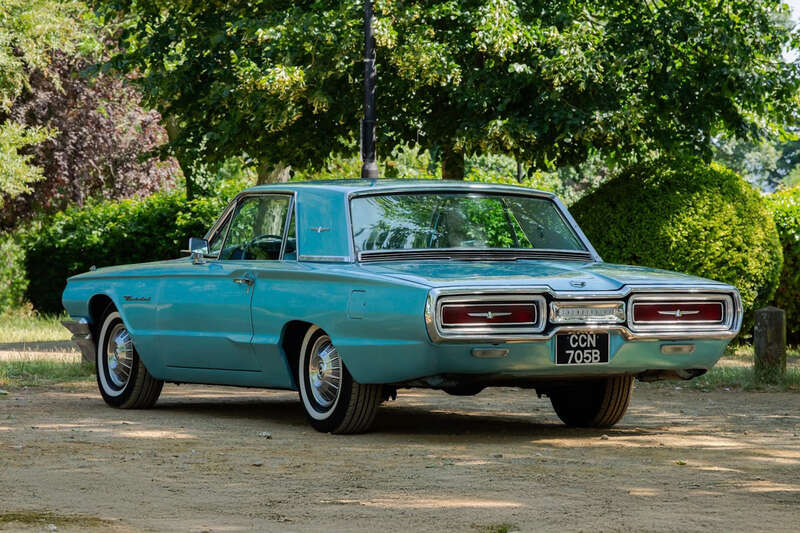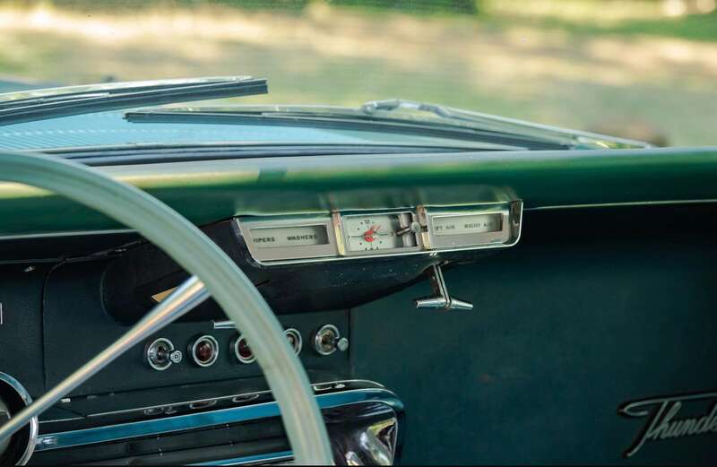 This 1964 Ford Thunderbird has undergone a five-year restoration with a bare-metal respray and mechanical overhauls, documented with restoration invoices and photos. Finished in Patrician Green with a turquoise interior, it features a 6.4-liter V8 engine and is supplied with original documents.