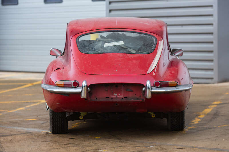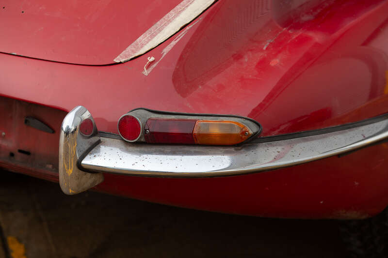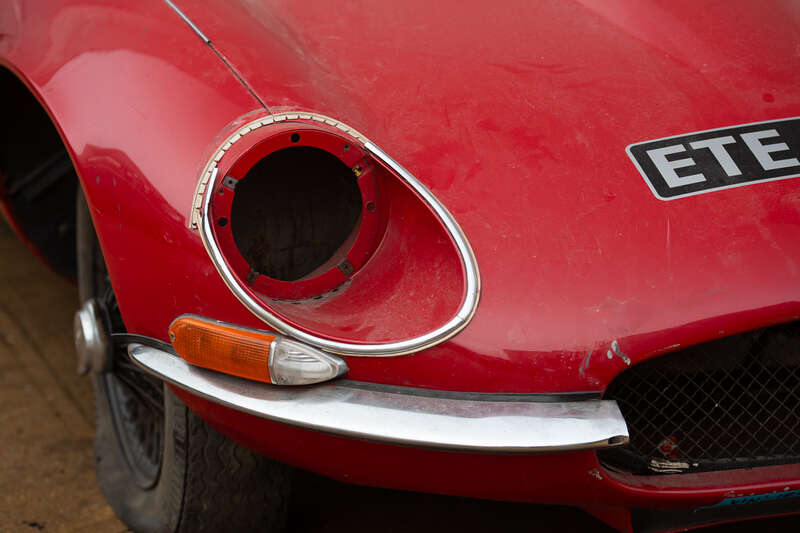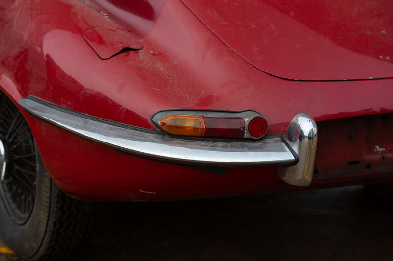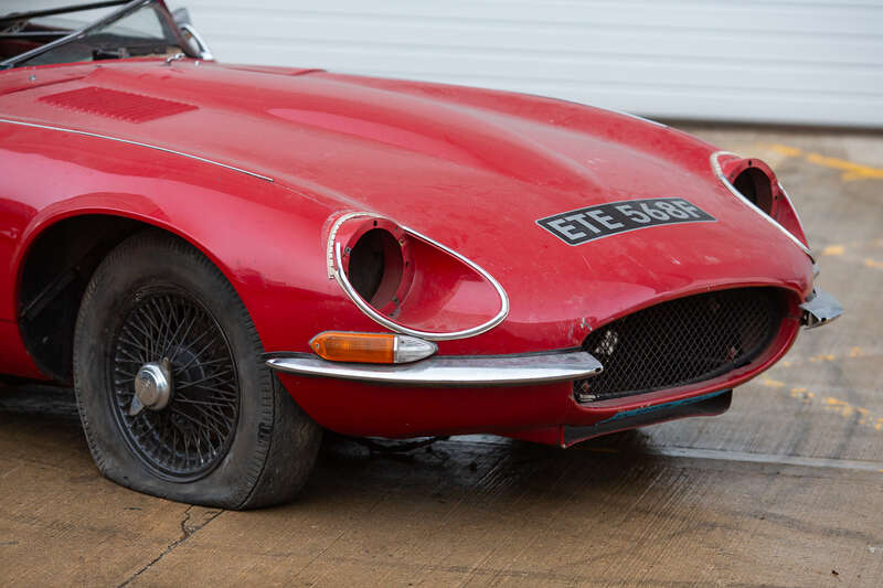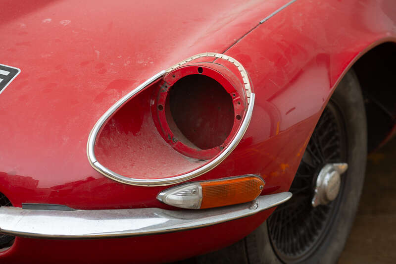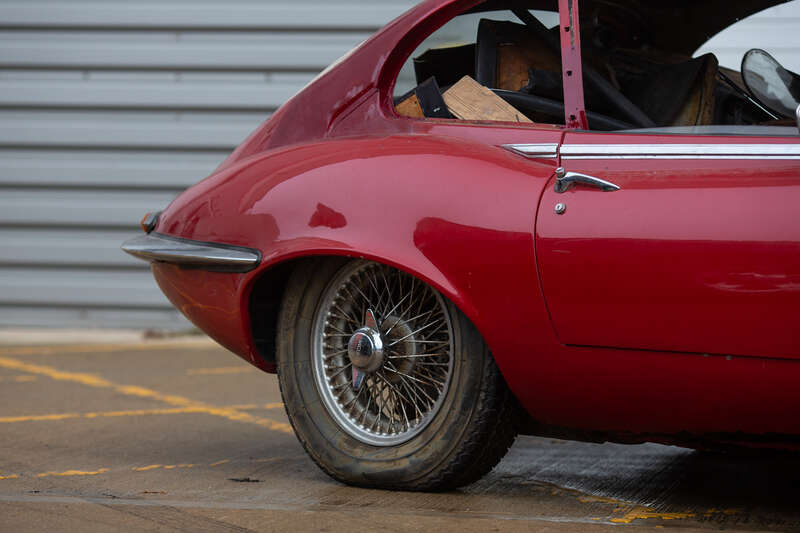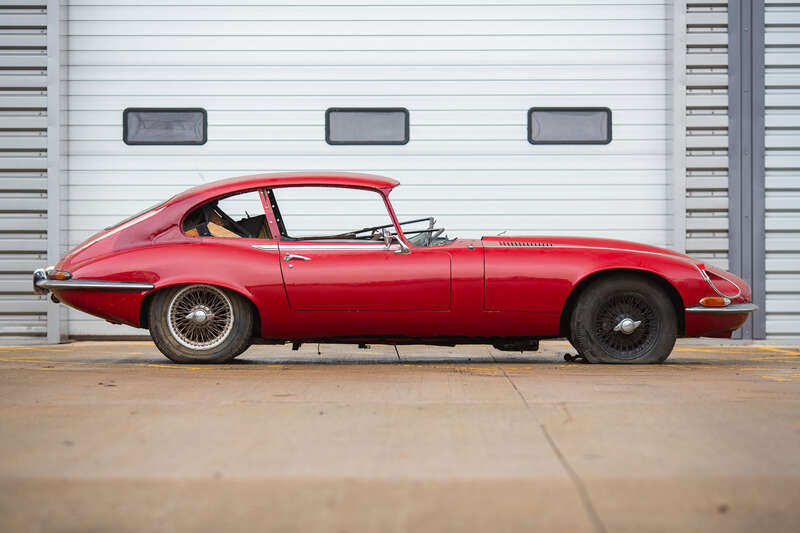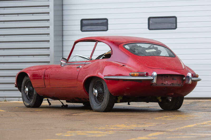 This 1967 Jaguar E-Type Series I.5 2+2, originally Opalescent Silver Blue but repainted red, features flared wheel arches and an automatic gearbox. Offered as a restoration project, it shows 72,200 miles believed to be genuine, and is available without reserve.