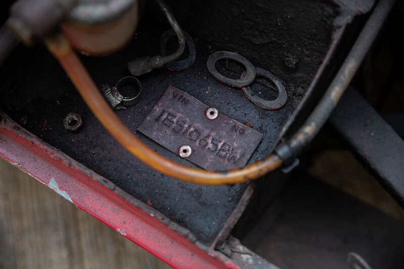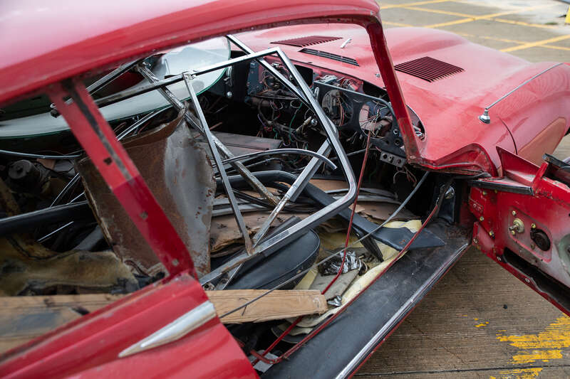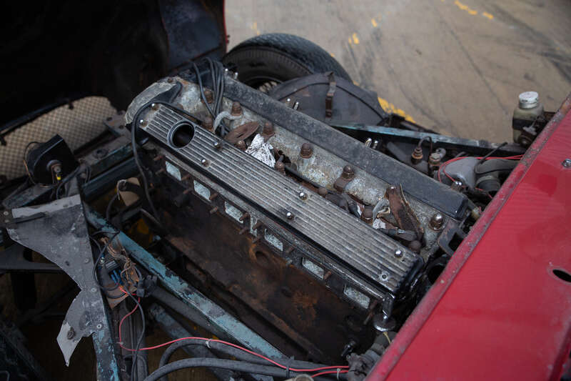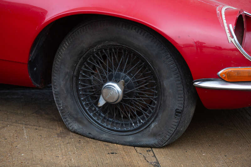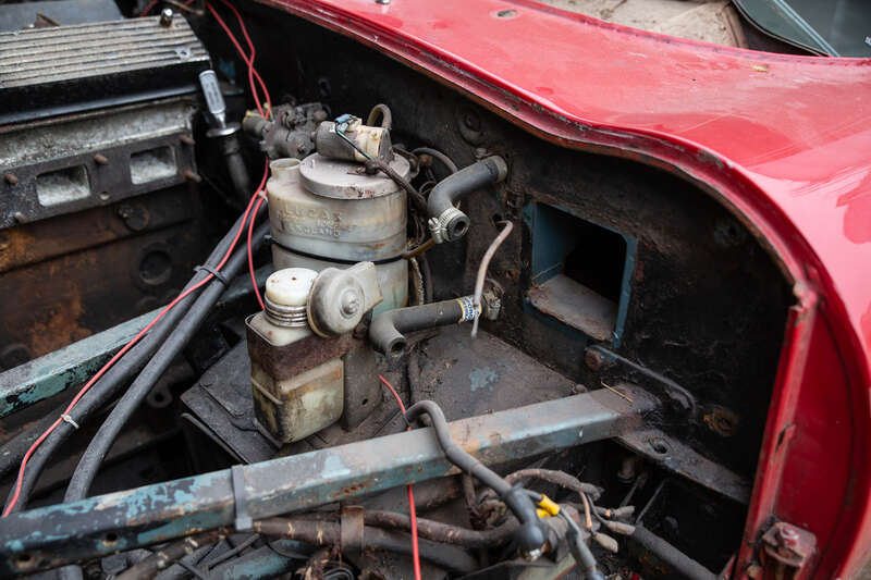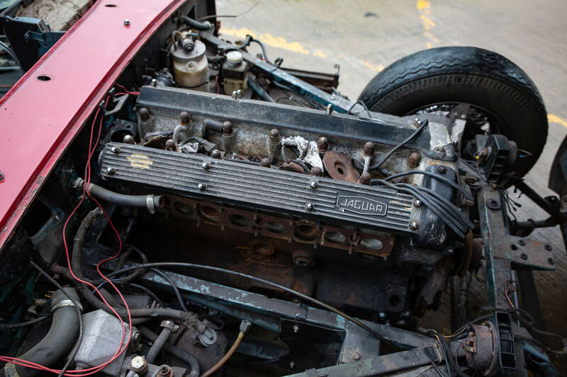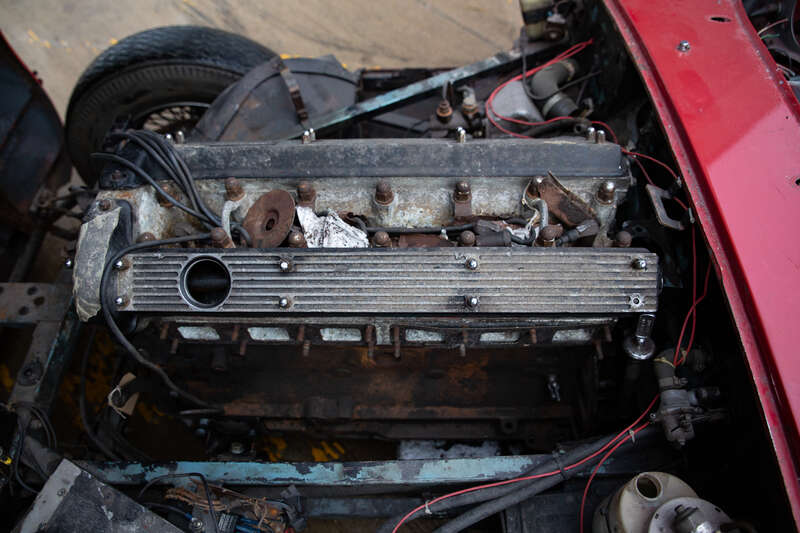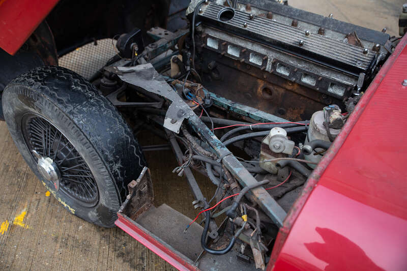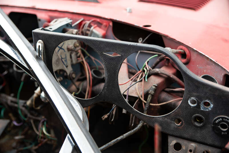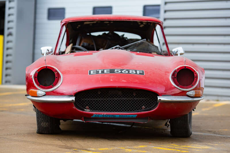 This 1967 Jaguar E-Type Series I.5 2+2, originally Opalescent Silver Blue but repainted red, features flared wheel arches and an automatic gearbox. Offered as a restoration project, it shows 72,200 miles believed to be genuine, and is available without reserve.