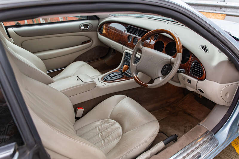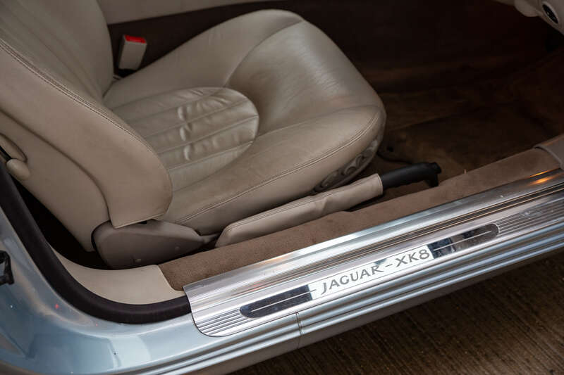 This 1997 Jaguar XK8 is a low-mileage example from its first year of production, finished in Ice Blue with an Oatmeal leather interior. It features a 4.0-liter V8 engine and a five-speed automatic gearbox, accompanied by a full history from new until 2017 and a valid MOT until April 2026, making it a desirable modern classic.