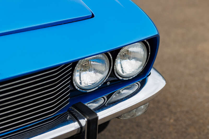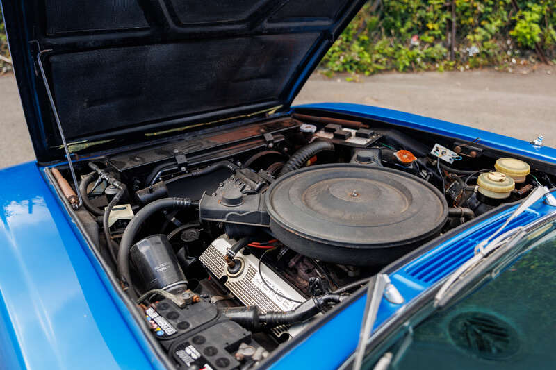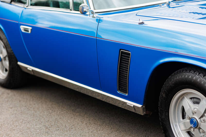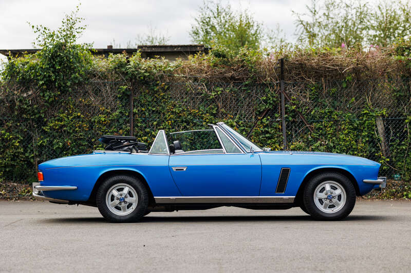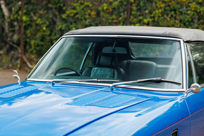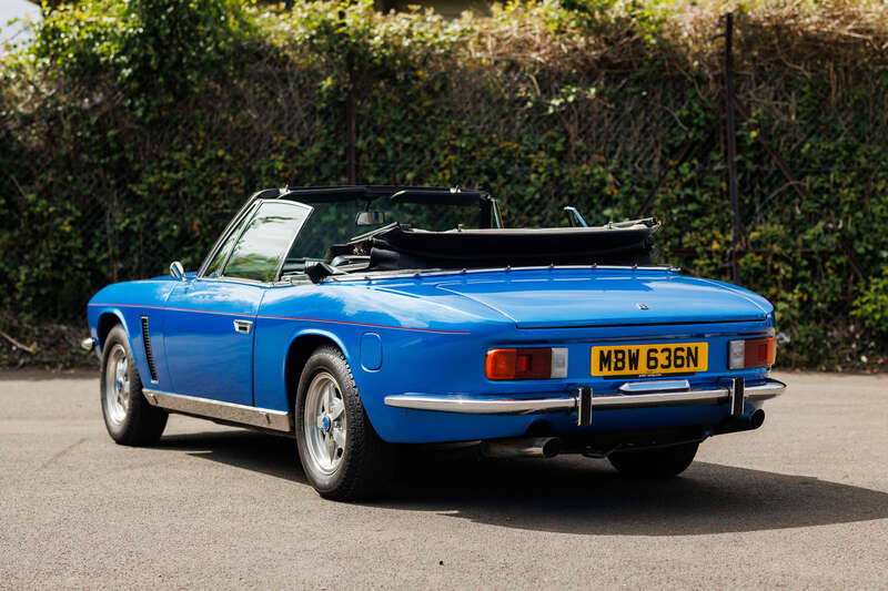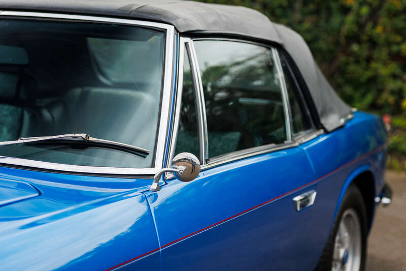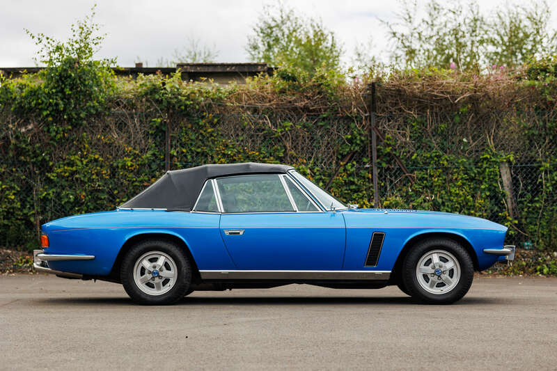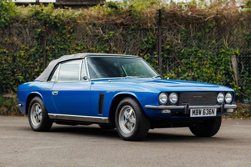 This 1974 Jensen Interceptor Convertible is a rare, right-hand drive example with a 7.2-liter V8 and automatic transmission. It features a Brienz Blue exterior, black leather interior with sheepskin inserts, and comes with a comprehensive history file.
