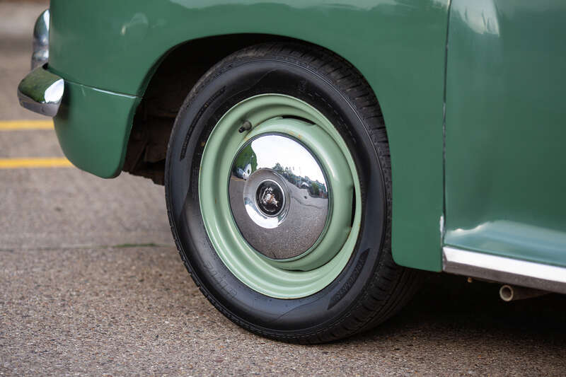 This 1960 Rover P4 100 is presented in Rush Green over Shadow Green, boasting a well-maintained dark green leather interior and a factory-fitted HMV valve radio. The car retains much of its original paintwork and transferable Warwickshire registration, making it an impressively original example.