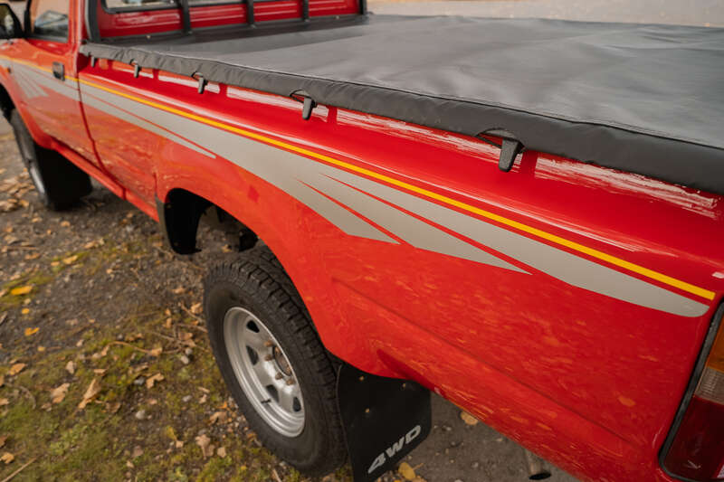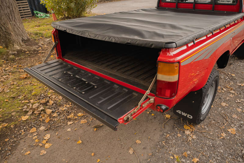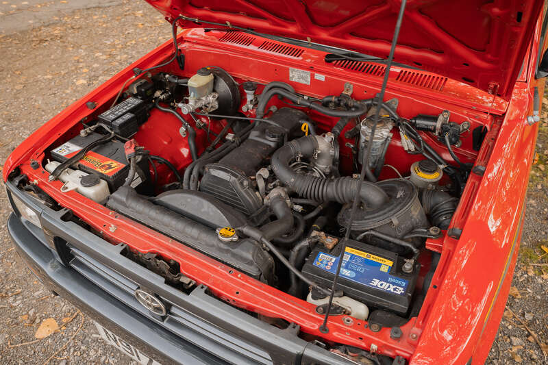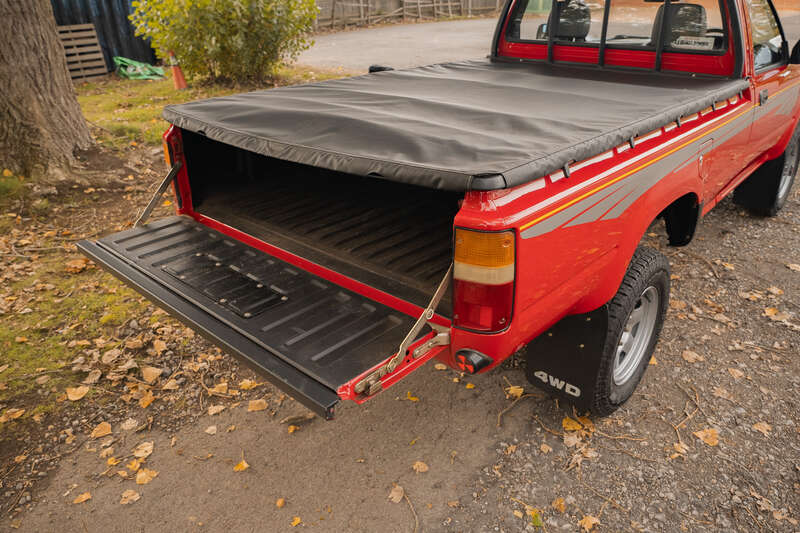 Bramall Toyota of Plymouth, finished in Flame Red with a grey cloth interior Powered by Toyota’s proven 2.4-litre four-cylinder petrol engine driving all four wheels through a 5-speed manual gearbox, renowned for its reliability and off-road capability Now showing a modest 72,599 miles, covered over the years by five former keepers, suggesting careful private use rather than a hard commercial life Largely in original specification, retaining its factory trim, wheels and switchgear, and benefiting from a lined load bed with matching cover Accompanied by its original book pack and stamped service book, providing evidence of conscientious maintenance throughout its life Increasingly appreciated as a modern classic, the Hilux combines period charm with legendary dependability — a rare opportunity to acquire a well preserved, low-mileage survivor Exterior