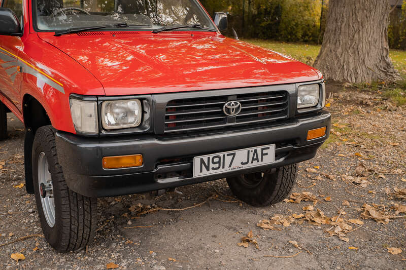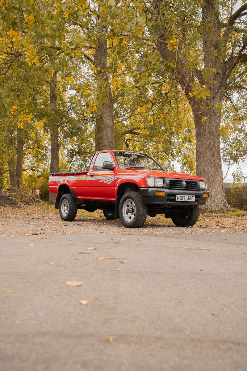 This 1996 Toyota Hilux Pick-Up 4x4 is a Flame Red example with 72,599 miles, powered by a 2.4-litre petrol engine and 5-speed manual gearbox. It's noted for its durability and off-road capability, accompanied by its original book pack and stamped service book.