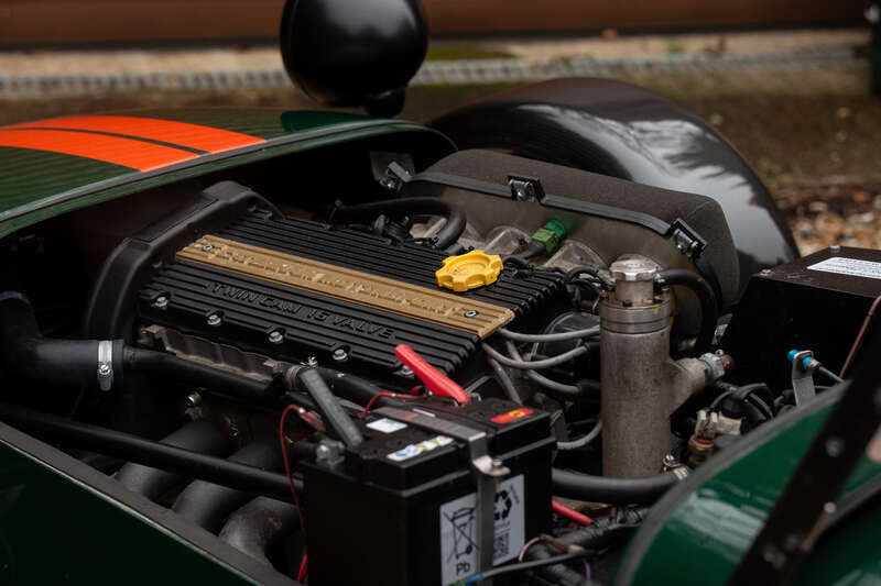 This Caterham Superlight R400 features a 1.8-litre engine, six-speed manual gearbox, and is built on the SV chassis. With carbon fibre components and recent maintenance, this rare model is presented in Lotus Green and Gulf Orange.