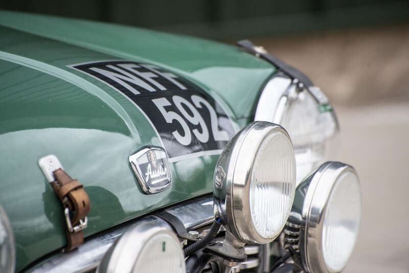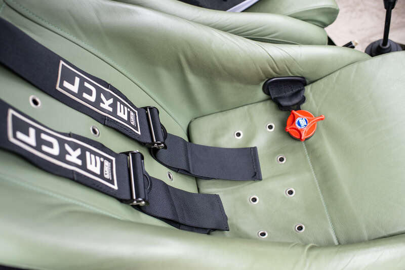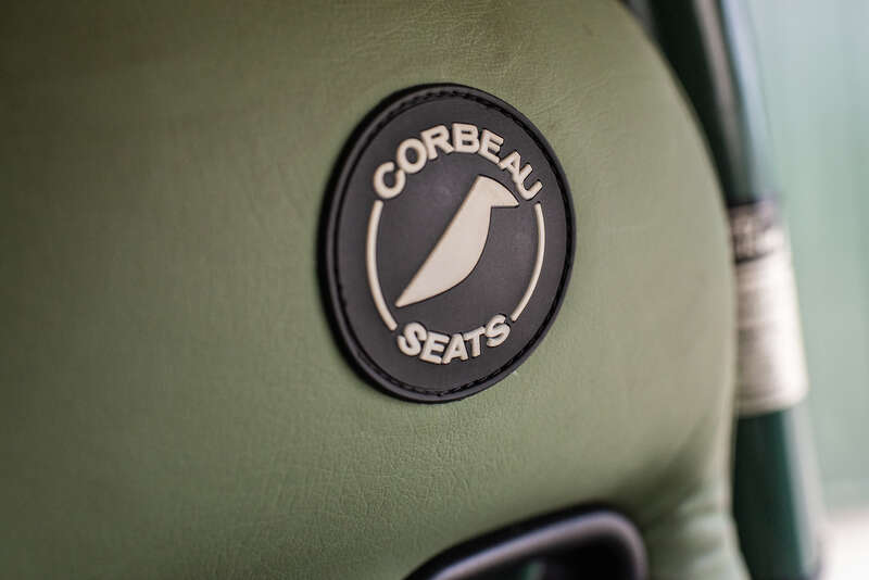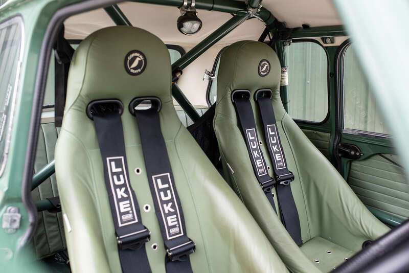 Authentic competition interior, featuring a period-correct dashboard, rally instrumentation and triple spotlights, complemented by period-style heated green leather seats