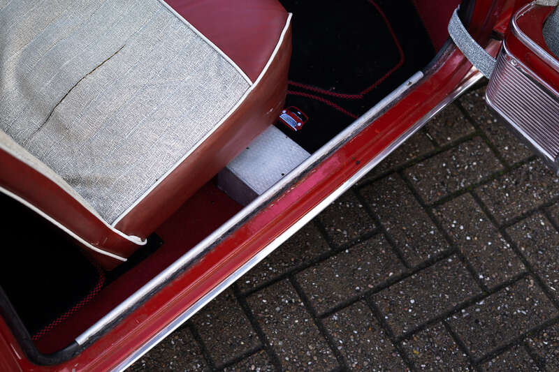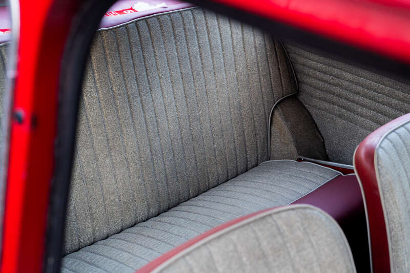 Sold by H.A.Saunders Ltd in Worcester, it's finished in Tartan Red with a red and gold brocade vinyl interior, retaining correct early features including sliding windows, pull-cord door handles, floor-mounted push-button starter and period-correct steel wheels