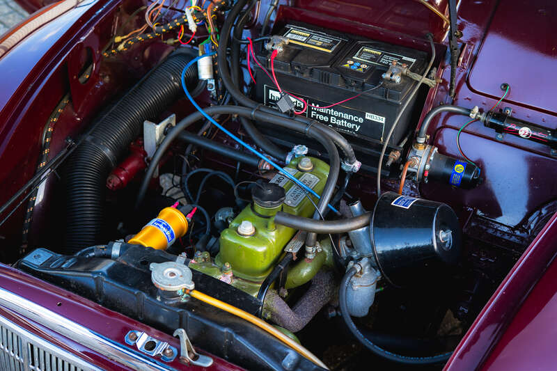 Presented in gleaming Maroon paintwork with straight panels, excellent bodywork including the underside, high quality re-trimmed upholstery (period correct in Beige with Maroon piping), a well-fitted hood, refurbished chrome and correct period appearance throughout including trafficators