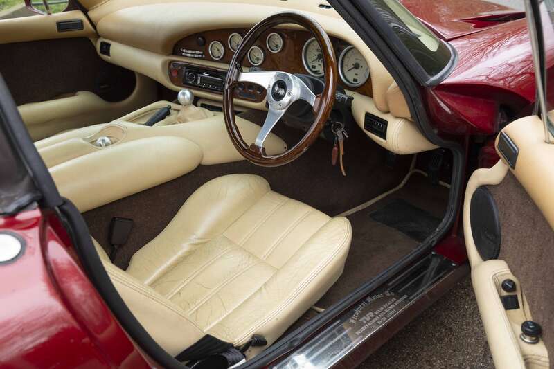 The striking example offered here is finished in Crimson Starmist over a classic TVR interior in cream leather with walnut veneers