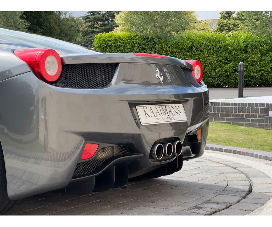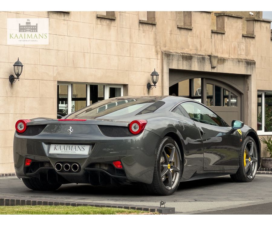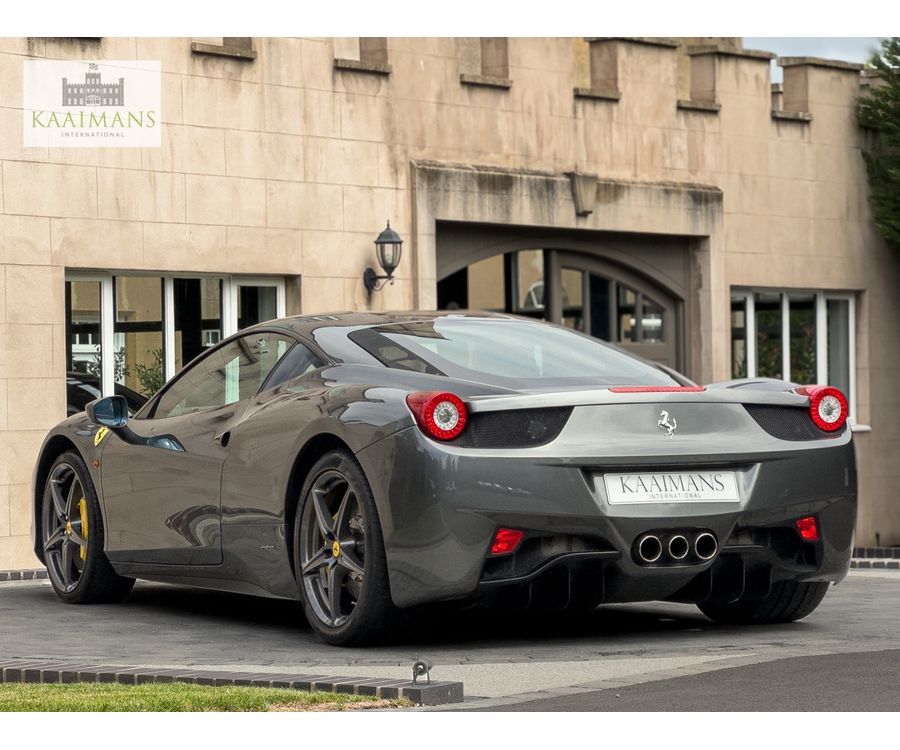 This 2012 Ferrari 458 Italia presented in stunning Grigio Silverstone over a refined leather/alcantara interior, is further enhanced by the factory-fitted Carbon Fibre Racing Seats and the desirable Allestimento Speciale Commessa Package which includes a special extended Leather/Alcantara interior, Grigio Ferro Metallic upper interior trim and Internal Speaker Grilles in Coloured Leather.