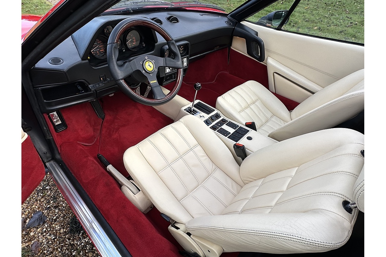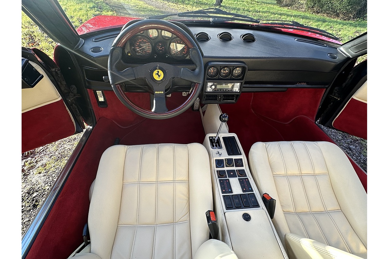 This is a rare, left-hand drive 1989 Ferrari 208 GTS Turbo with relatively low mileage (55,000 km). It has had significant recent maintenance and a long MOT, making it a desirable classic.