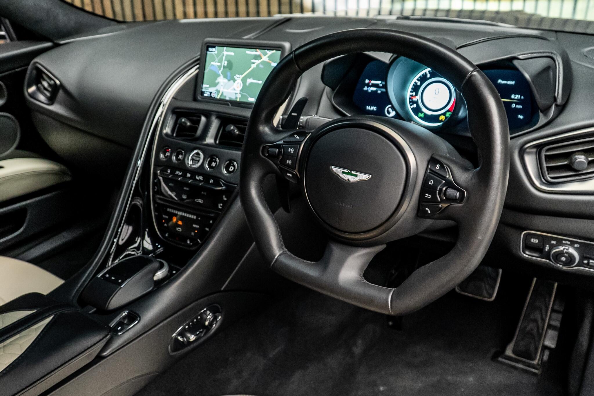 Inside, you'll find a sports steering wheel crafted from Q Satin 2x2 Twill Carbon Fibre, heavy pile floor mats, and exquisite Aston Martin Wings embroidery on the seats, showcasing meticulous attention to detail.