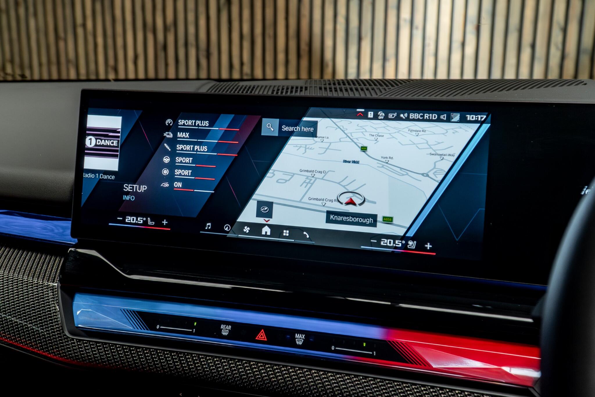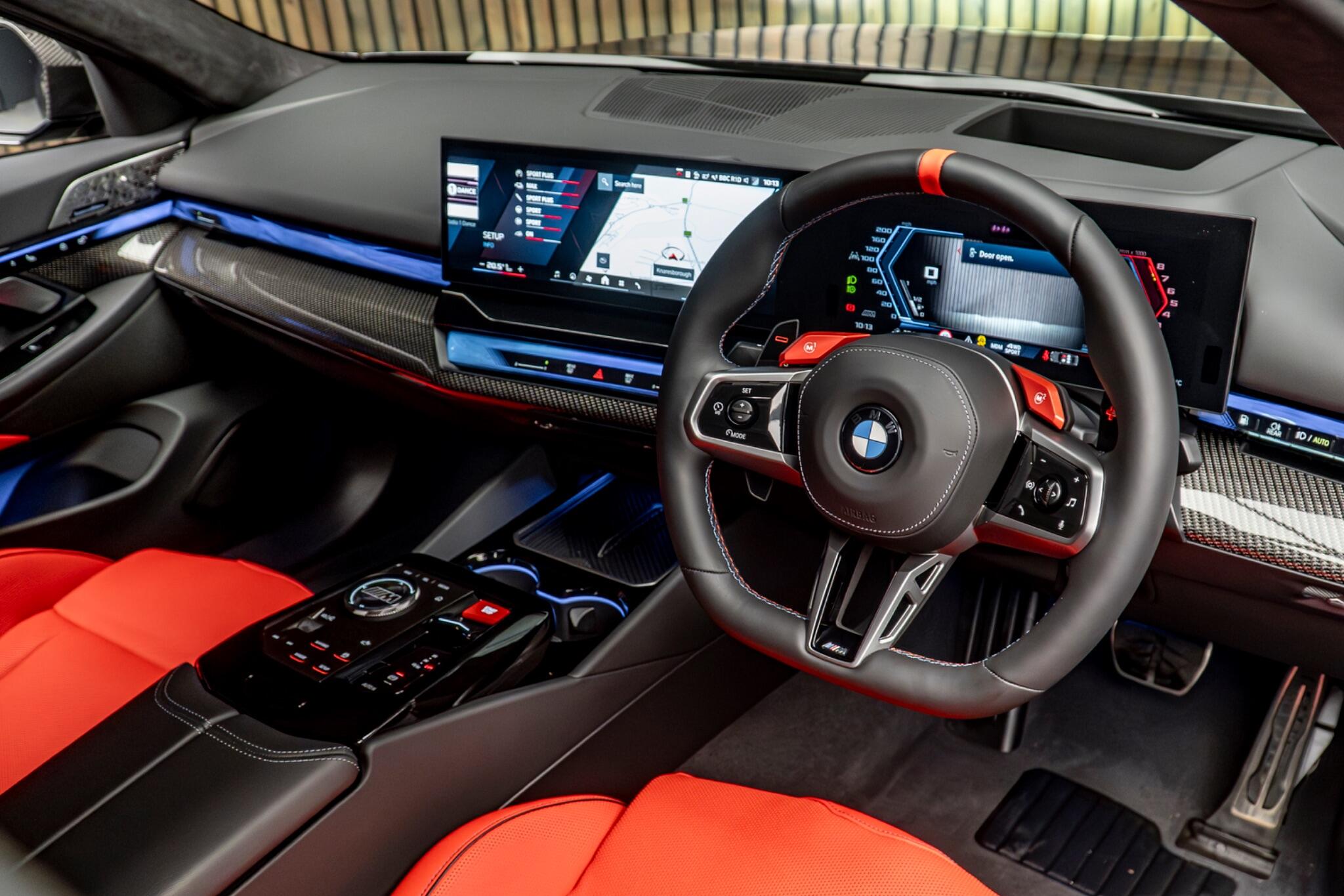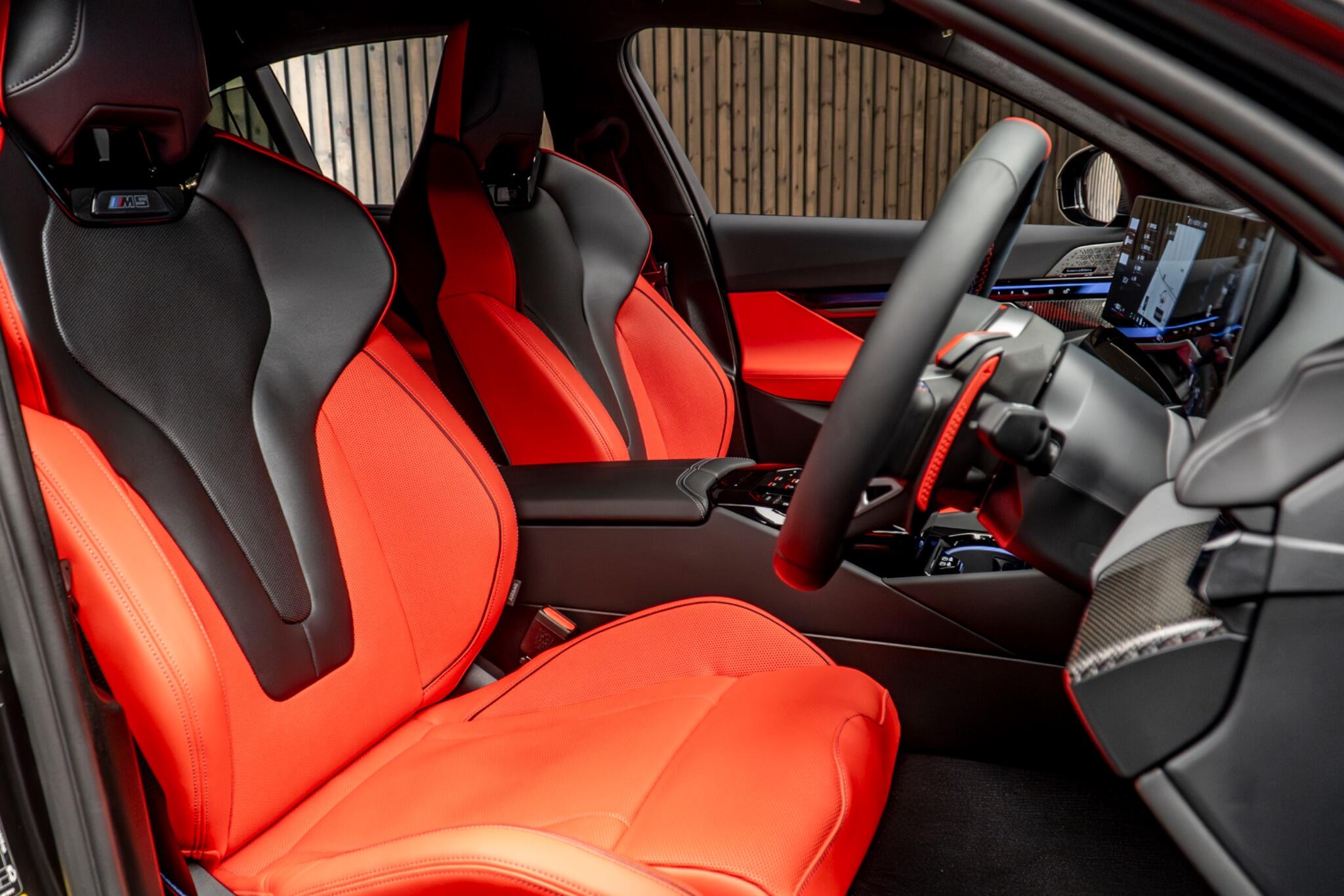 Inside, the cabin is appointed with striking Merino leather in a red black combination, complemented by a sophisticated trim of dark silver M accent, carbon fibre, and high gloss silver threads, all enhanced by the M Carbon exterior package.