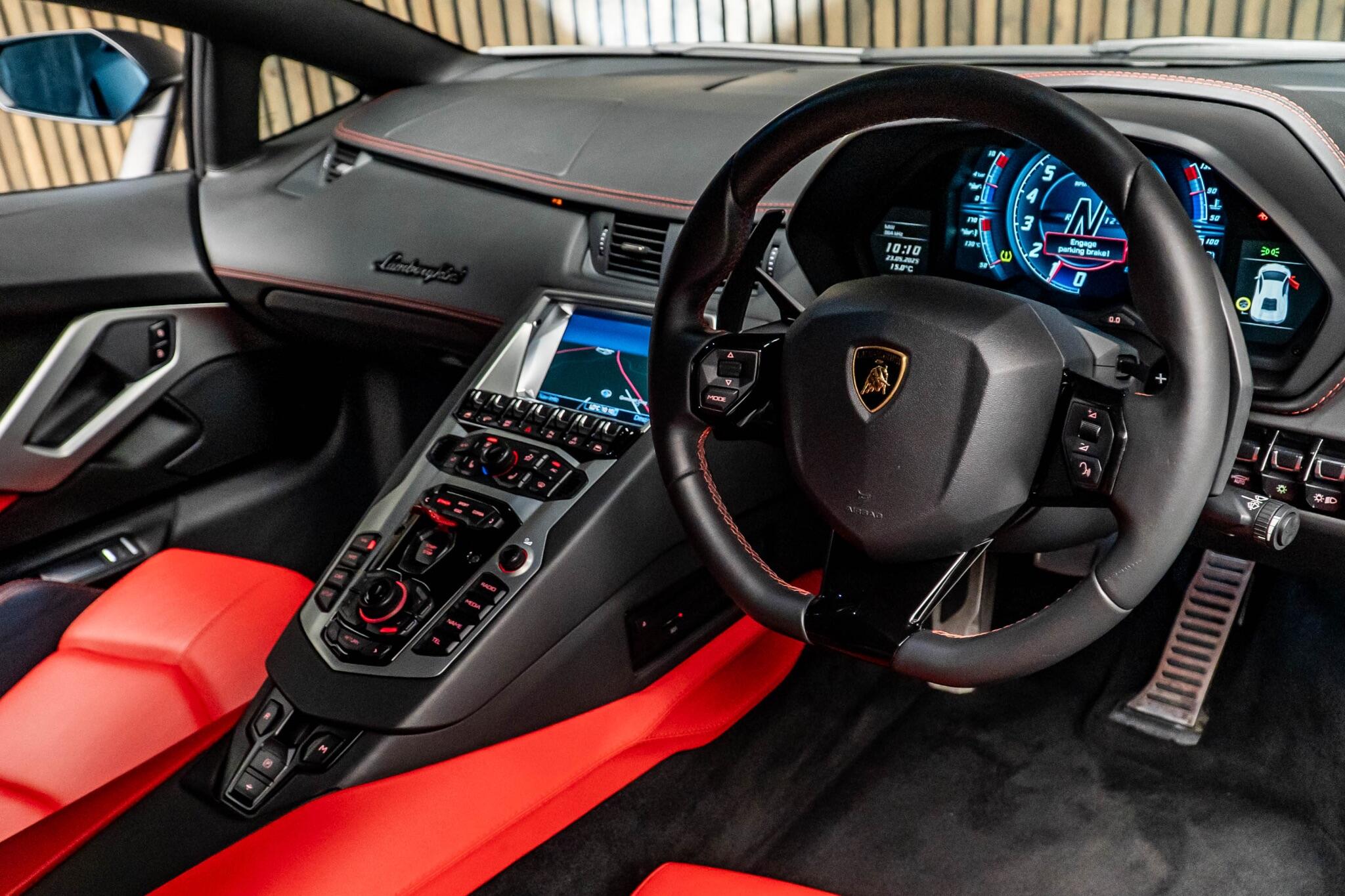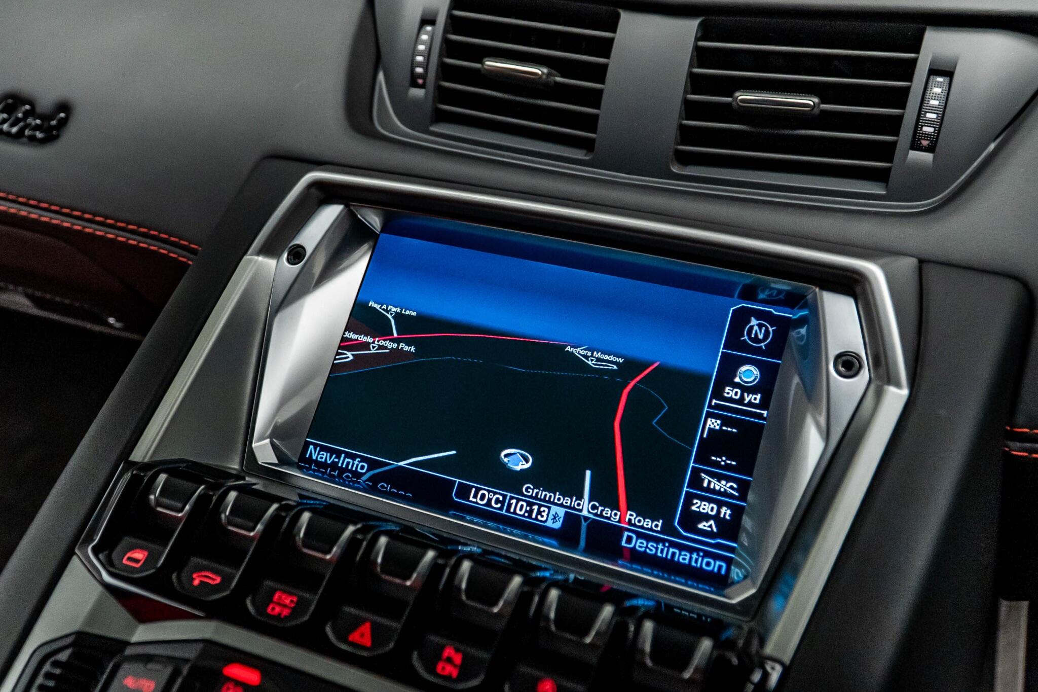 The Aventador comes equipped with a comprehensive audio system including AM-FM radio, CD player, and digital media card compatibility.