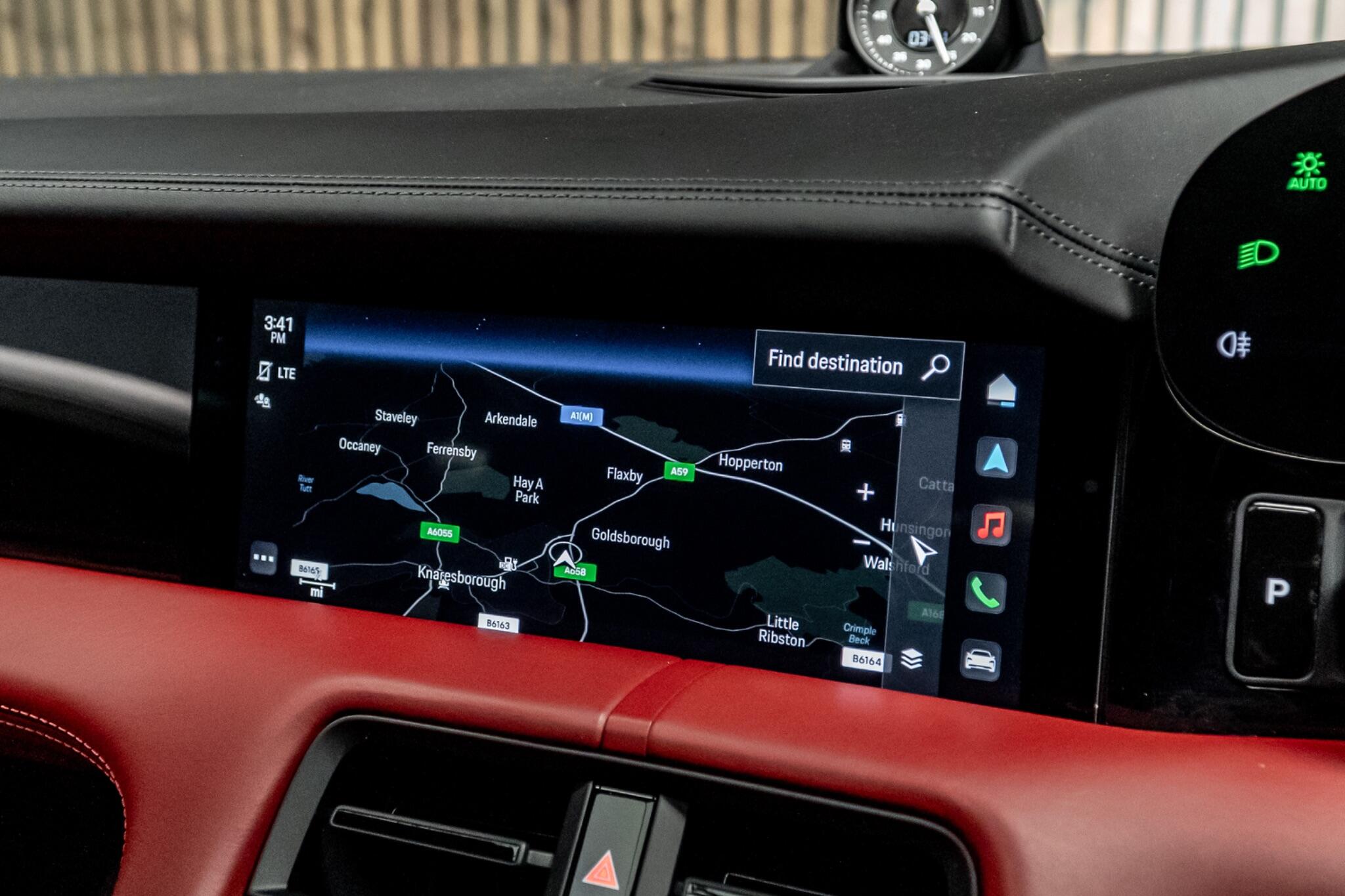 The front comfort seats are 14-way electrically adjustable with a memory package, and the vehicle is equipped with LED Matrix headlights including Porsche Dynamic Light System Plus.