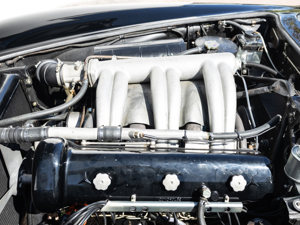 The car underwent a recommissioning worth €140,000 by Mercedes-Benz specialists, and a 2025 inspection report by Mercedes-Benz Heritage is included. The description mentions that the car is now finished in black over a black leather interior, suggesting a change from its original Light Blue Metallic over Light Grey interior, which implies some restoration work. However, the description also notes that the car retains its matching-numbers body, chassis, and engine.