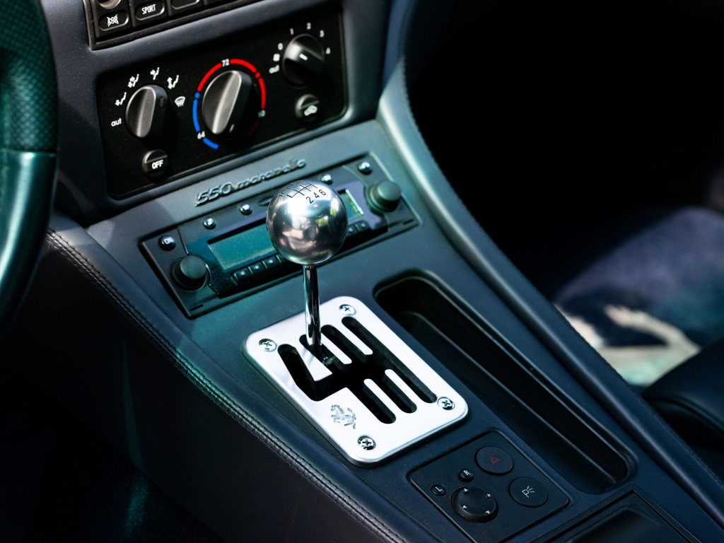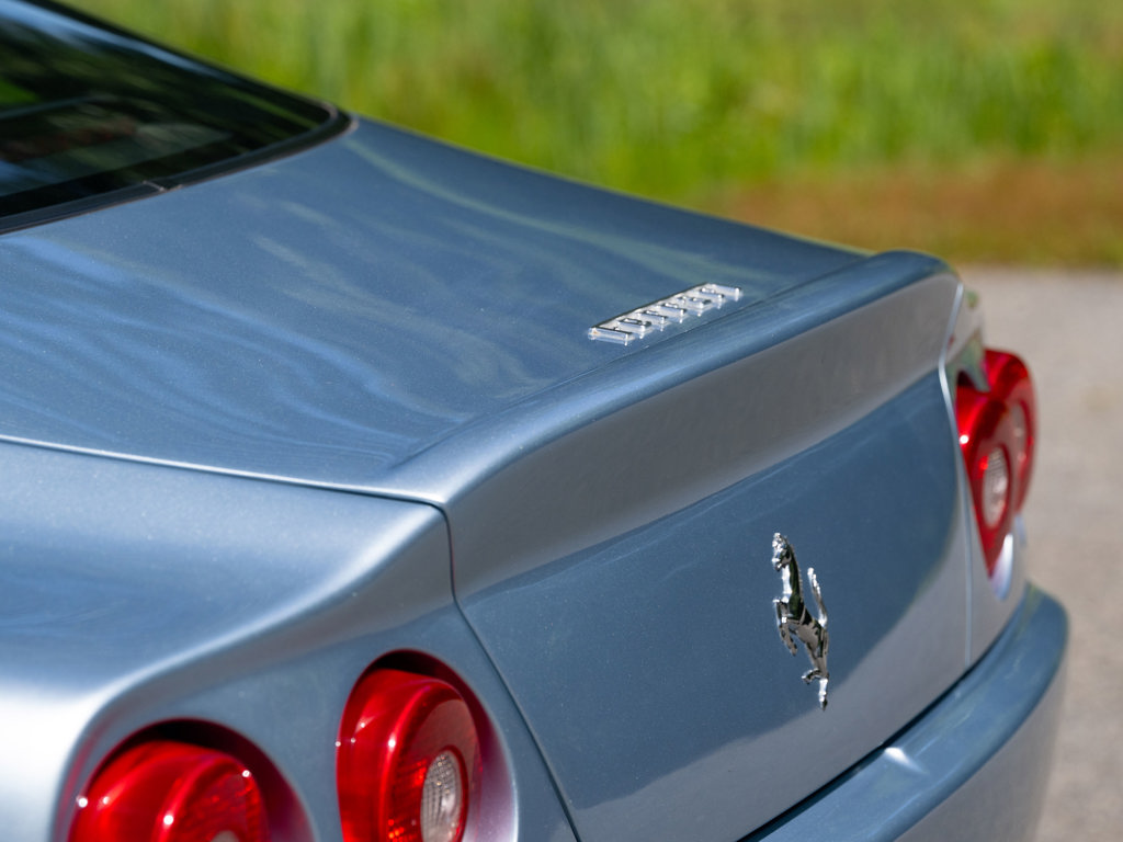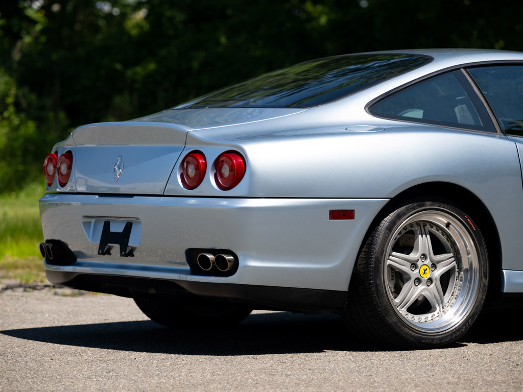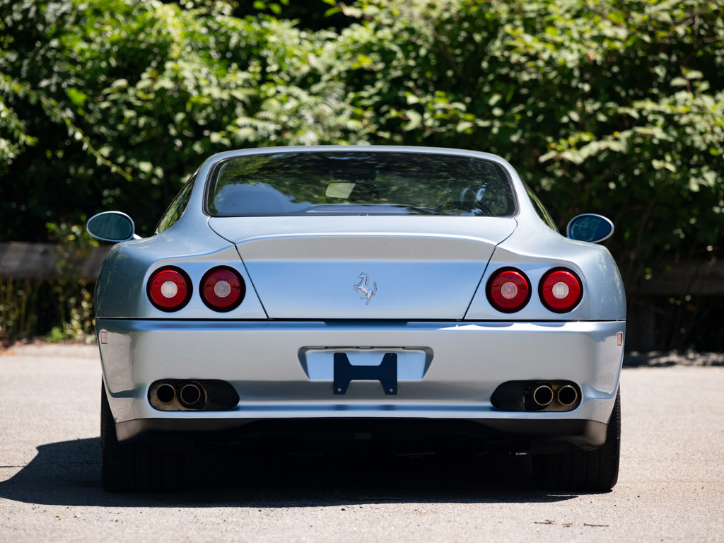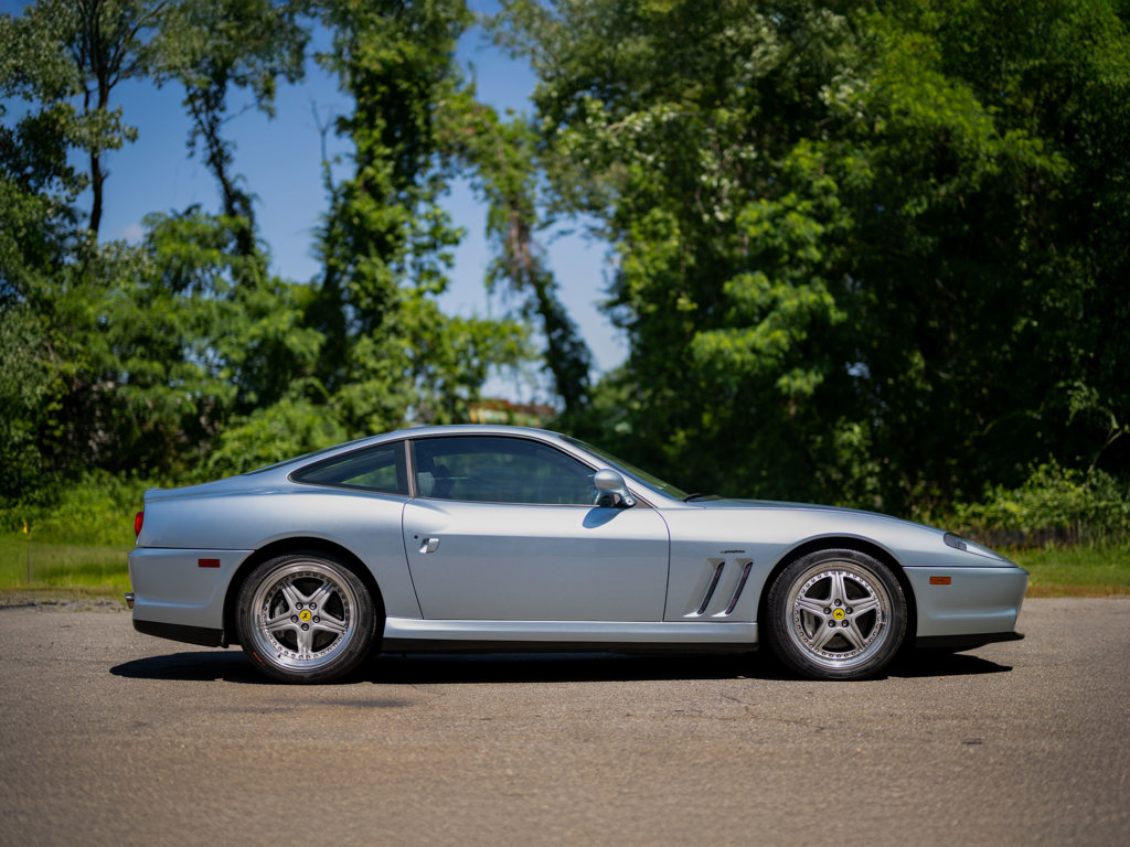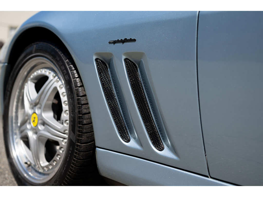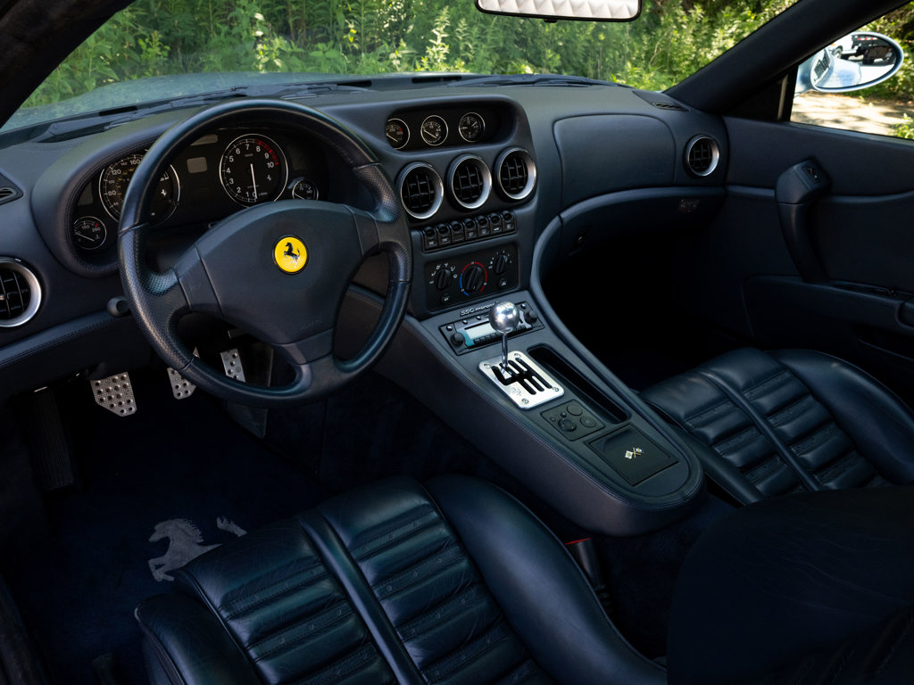 This 2001 Ferrari 550 Maranello is a low-mileage example of Ferrari's front-engine V-12 grand tourers, equipped with a desirable gated six-speed manual gearbox. Finished in Grigio Alloy over dark blue leather, it features Daytona-style seats and modular wheels, contributing to its appeal and value.