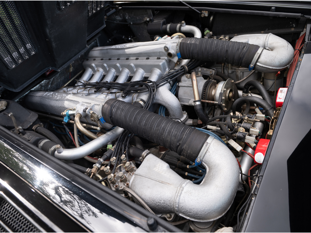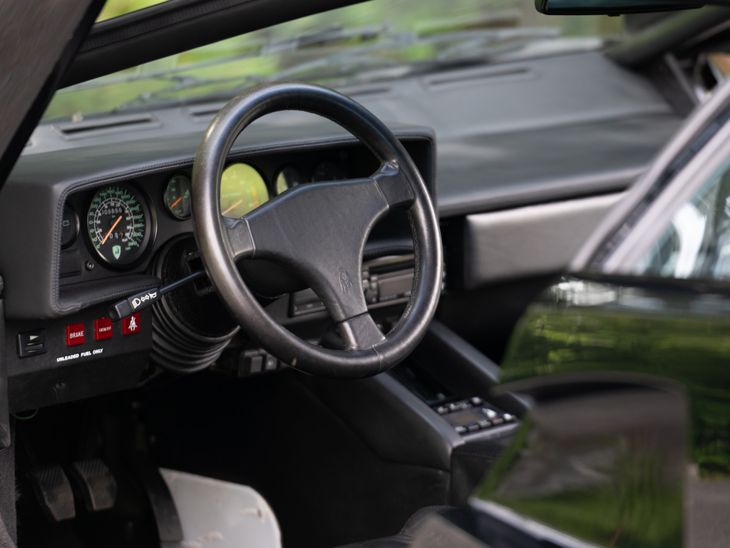 Final chapter of the legendary Countach, fine-tuned by Horacio Pagani One of approximately 657 examples constructed Displays just 5,655 km (~3,514 mi.) at cataloguing time Attractive factory colors of black over black leather trim Equipped with optional rear wing and accompanied by service records, tool roll along, original sales documents, window sticker, and warranty booklet