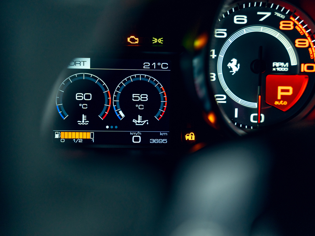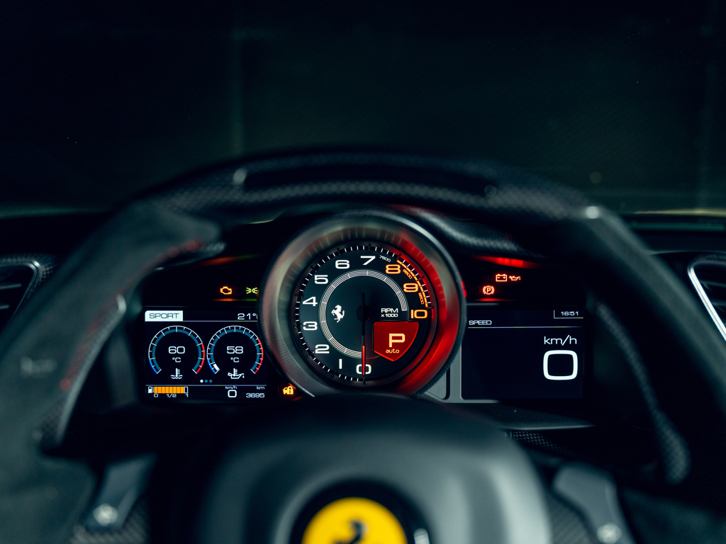 The car has very low mileage (3,695 kilometers), is certified by Ferrari, and has been retained by The Tailored For Speed Collection since new, suggesting it has been well-maintained and is in near-perfect condition with only minor signs of use.
