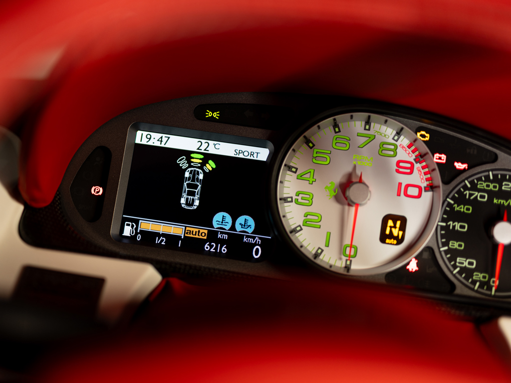 The car displays just 6,216 kilometers and is certified by Ferrari Classiche. It's exceptionally well-serviced, with a recent fluid and filter service. There's no mention of any dents, paint damage, or curb marks.